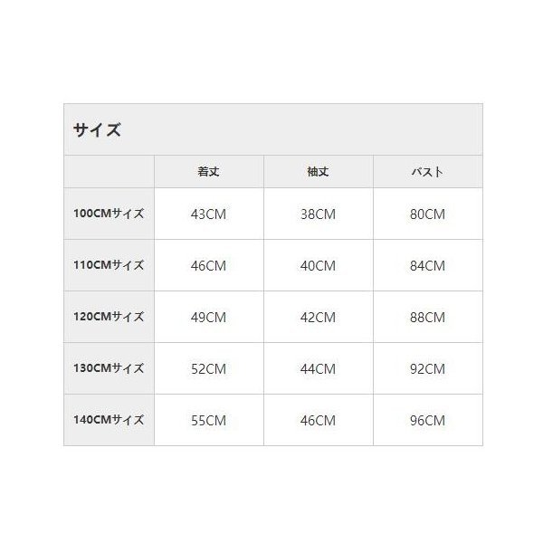 | サイズについての説明 | 【サイズ】 100CMサイズ 着丈43CM 袖丈38CM バスト80CM 110CMサイズ 着丈46CM 袖丈40CM バスト84CM 120CMサイズ 着丈49CM 袖丈42CM バスト88CM 130CMサイズ 着丈52CM 袖丈44CM バスト92CM 140CMサイズ 着丈55CM 袖丈46CM バスト96CM |