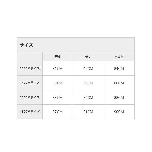 | サイズについての説明 | 【サイズ】単位:CM 着丈 袖丈 バスト 130 51 49 84 140 53 50 86 150 55 50 88 160 57 51 90 |
