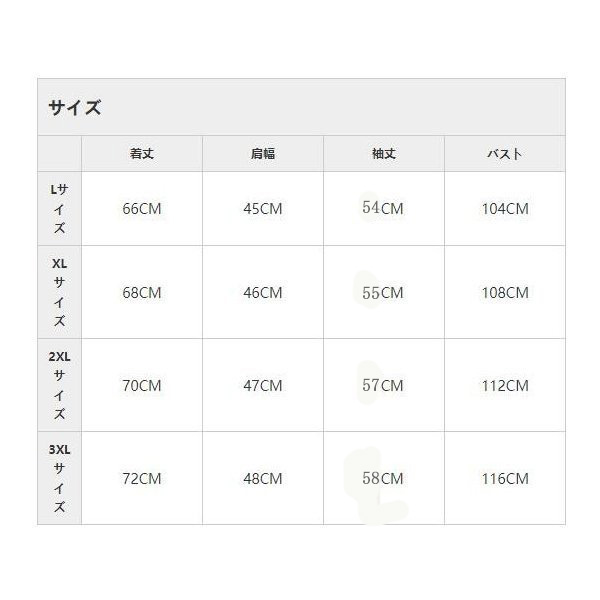 | サイズについての説明 | (サイズ)単位:CM 着丈 肩幅 袖丈 バストL 66 45 64 104XL 68 46 65 1082XL 70 47 67 1123XL 72 48 68 116 |