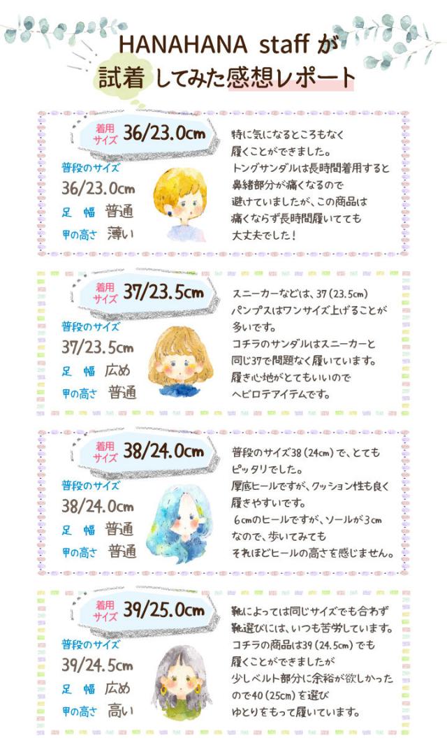 | サイズについての説明 | サイズ(cm):23・23.5・24・24.5・25・25.5 厚み:ソール3cm、ヒール6cm |