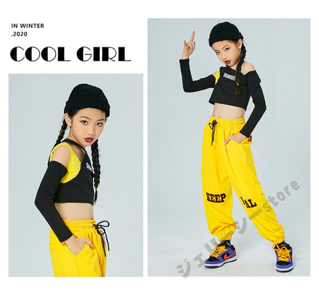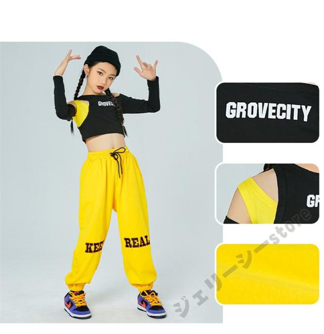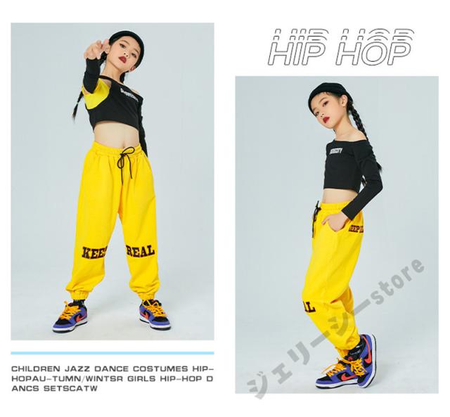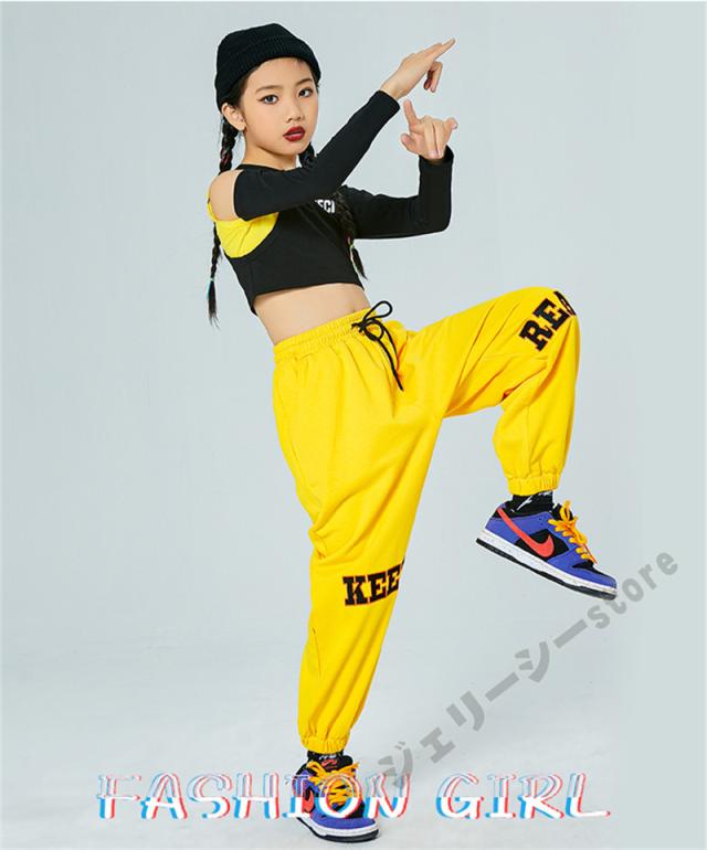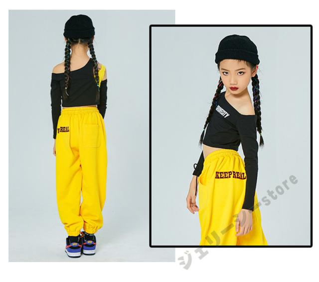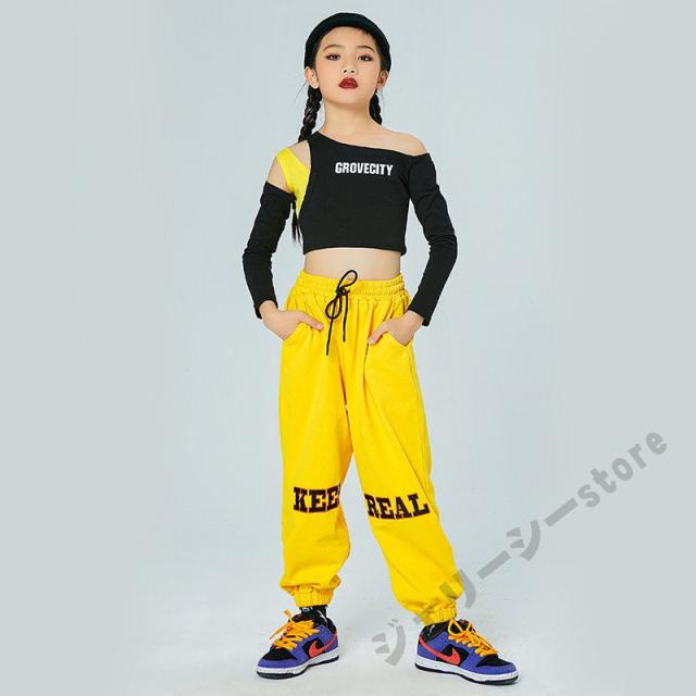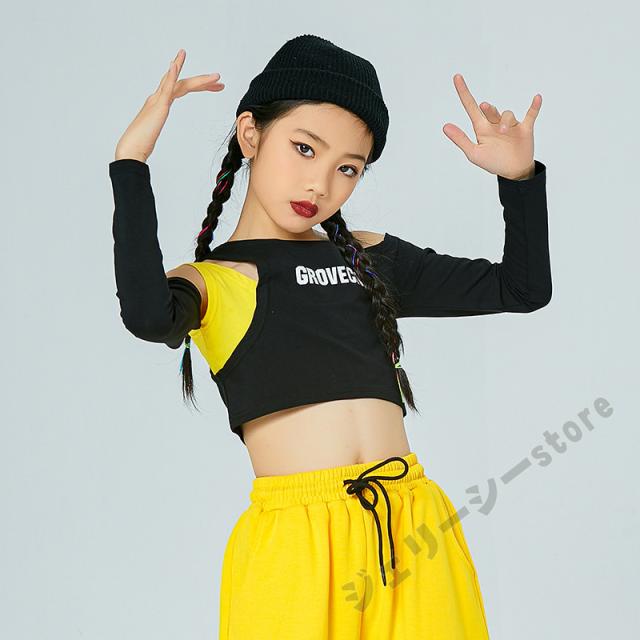 キッズ ダンス衣装 ヒップホップ ロングパンツ 長袖 子供ダンス へそ出し 練習着 セットアップ 演出服 発表会 ブラック イエロー