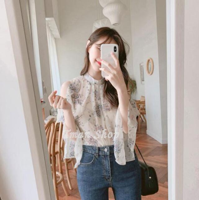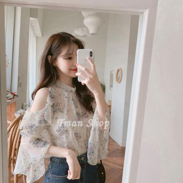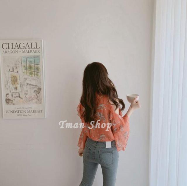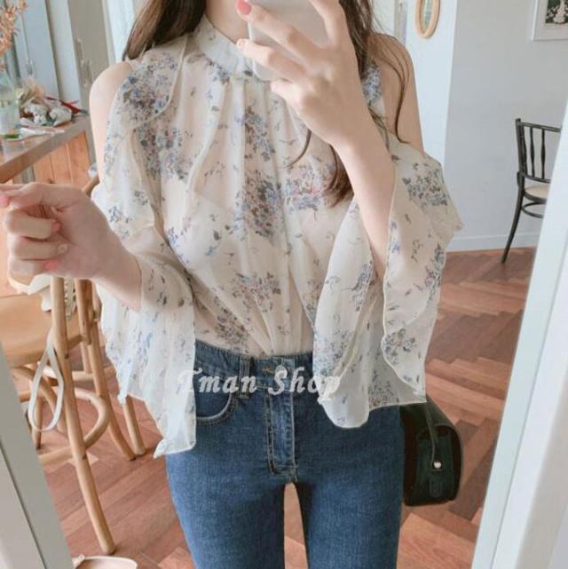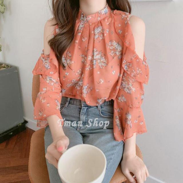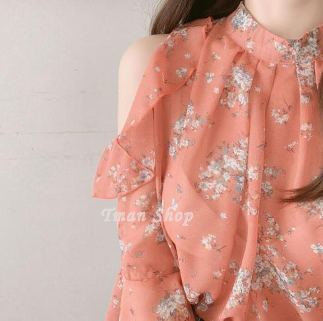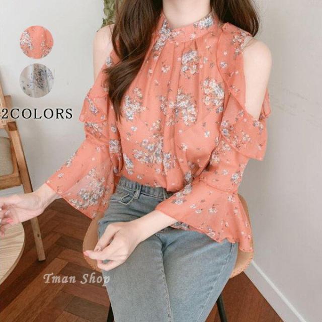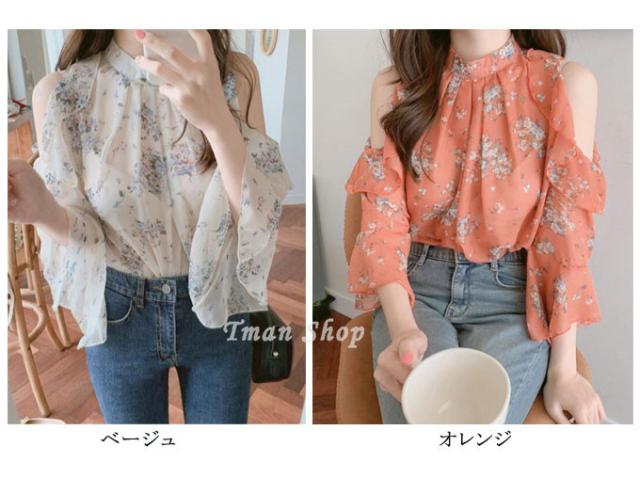 花柄ブラウス 7分袖 シフォンシャツ レデイース オフショルダー トップス ゆったり 体型カバー 痩せ フリル 可愛い 上品 大人 20代 30代 40代 通勤 通学 春夏