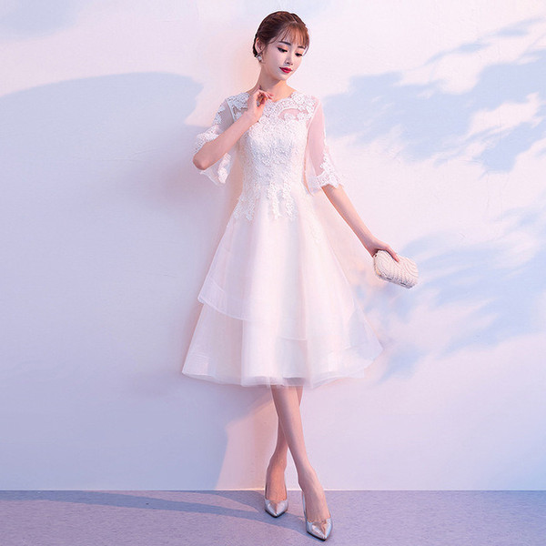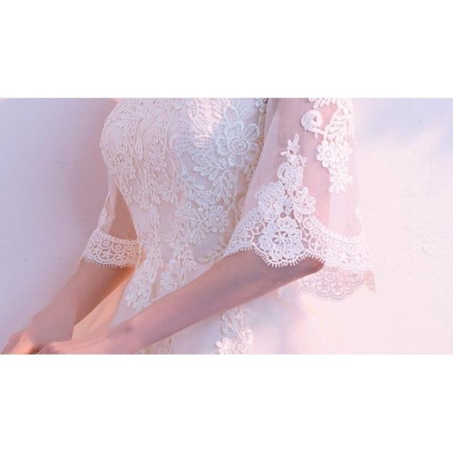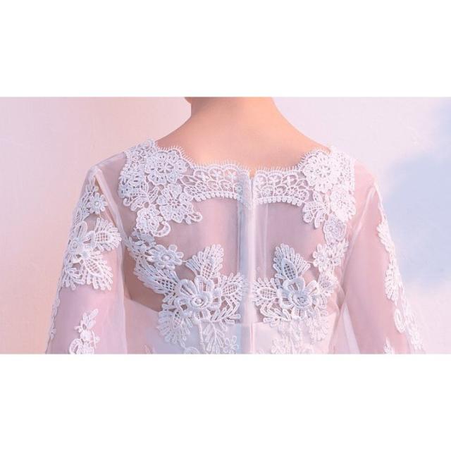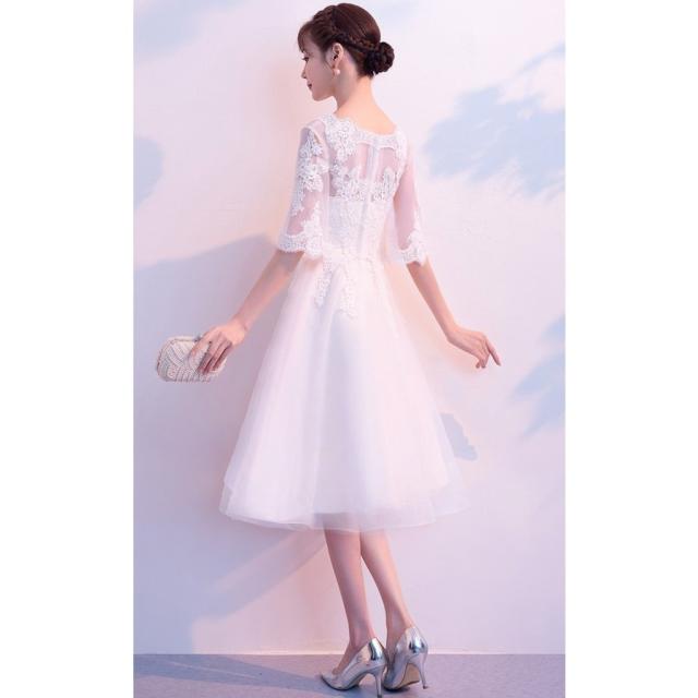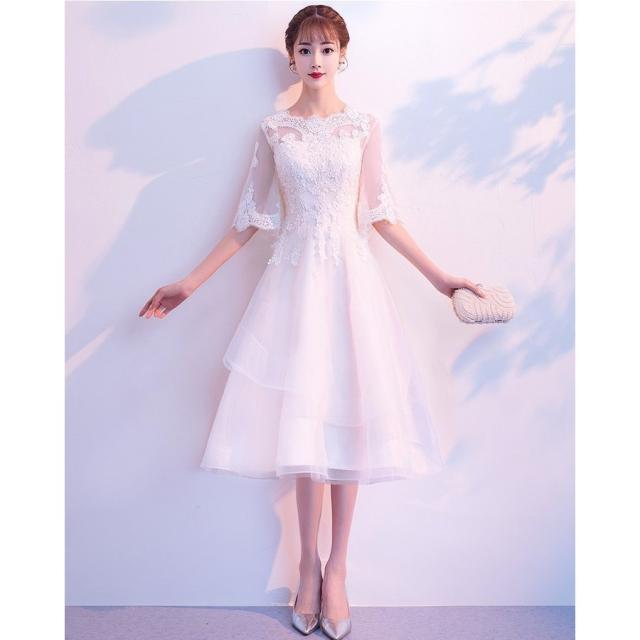 パーティードレス ミディアムドレス 白 ワンピース 披露宴 結婚式 二次会 花嫁ドレス ウエディングドレス 袖あり【ミディ丈】