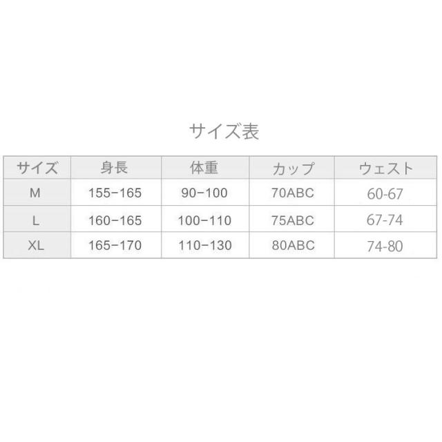 | サイズについての説明 | (約) *参考体重(KG):45-50(M)50-55(L)55-65(XL) *参考身長:155-165(M)160-165(L)165-170(XL) *ウエスト:60-67(M)67-74(L)74-80(XL) *カップ:70ABC(M)75ABC(L)80ABC(XL) |