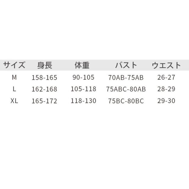 | サイズについての説明 | (約) *参考体重(KG):45-52(M) 52-59(L) 59-65(XL) *参考身長:158-165(M) 162-168(L) 165-172(XL) *ウエスト:26-27(M) 28-29(L) 29-30(XL) *バスト:70AB-75AB(M) 75ABC-80AB(L) 75BC-80BC(XL) |
