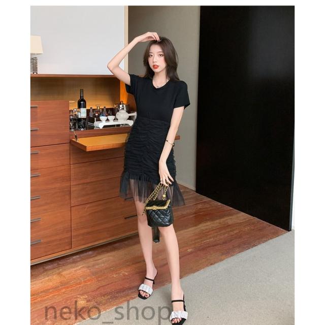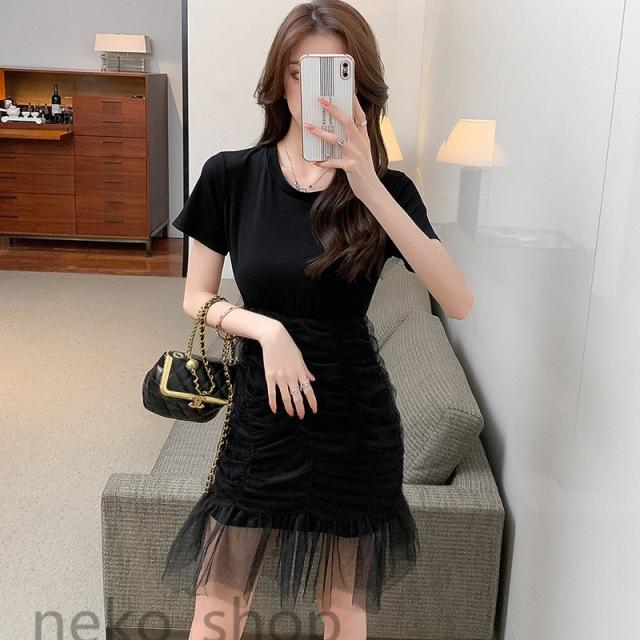 ワンピースレディース 半袖 ボディコン ショートタイトワンピース メッシュ切替 ギャザーワンピース 無地 シンプル ヒップパック 着痩せ ドレス 韓国風