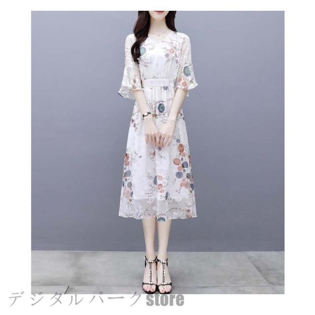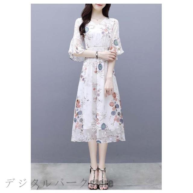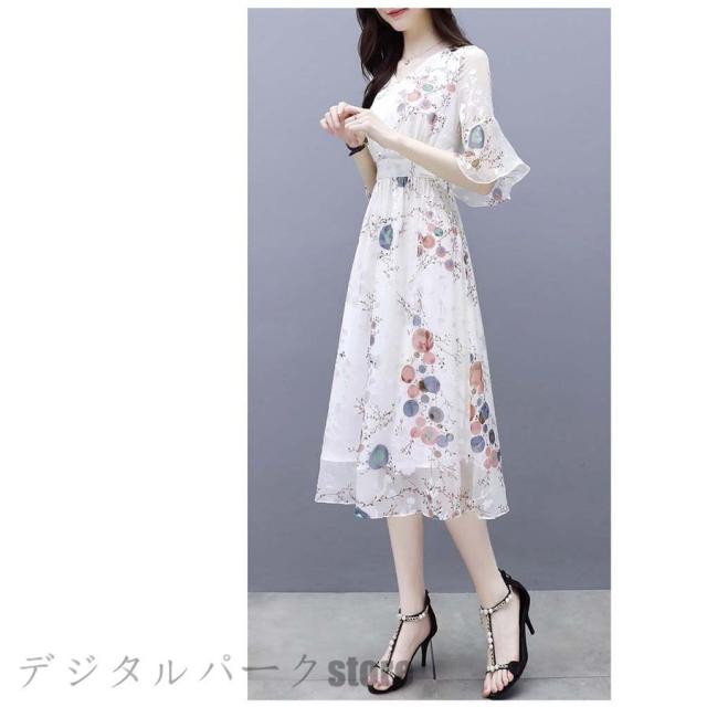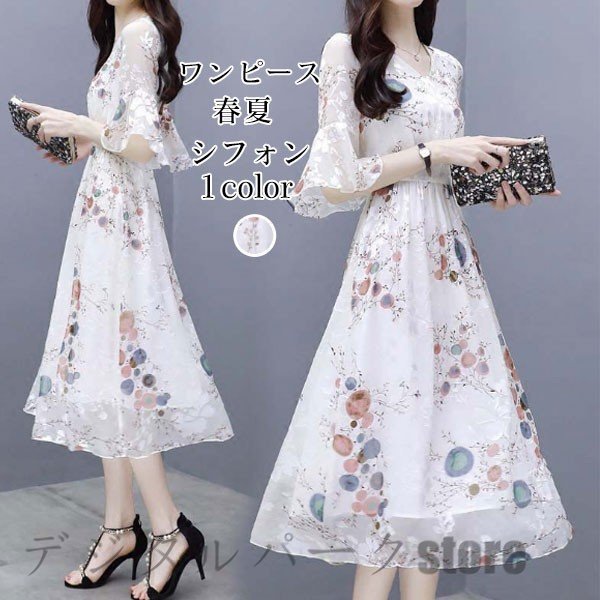 ワンピース レディース 春夏 マキシ丈ワンピース きれいめ シフォン 花柄 白 大きいサイズ 五分袖 マキシ丈ワンピース 結婚式 ドレス オシャレ 上品