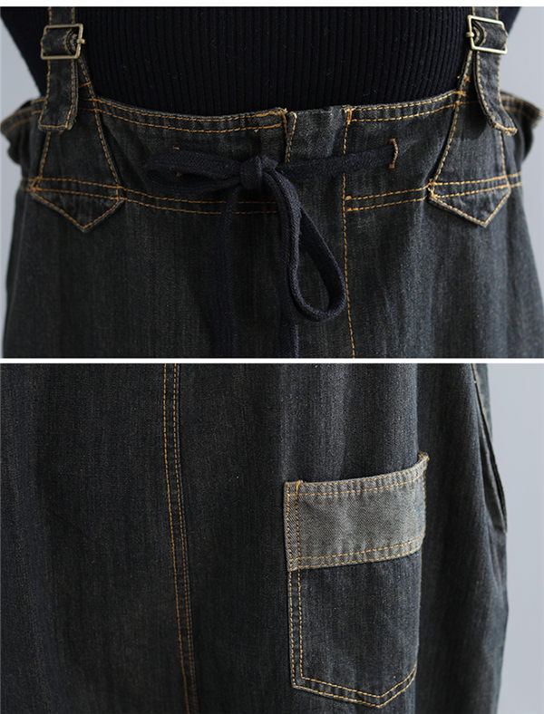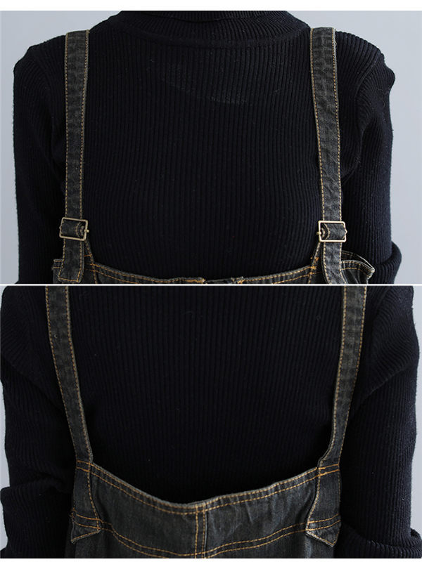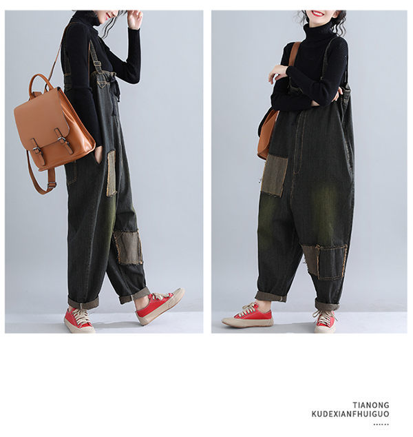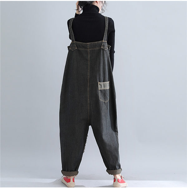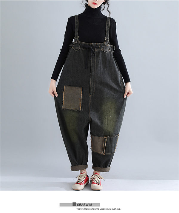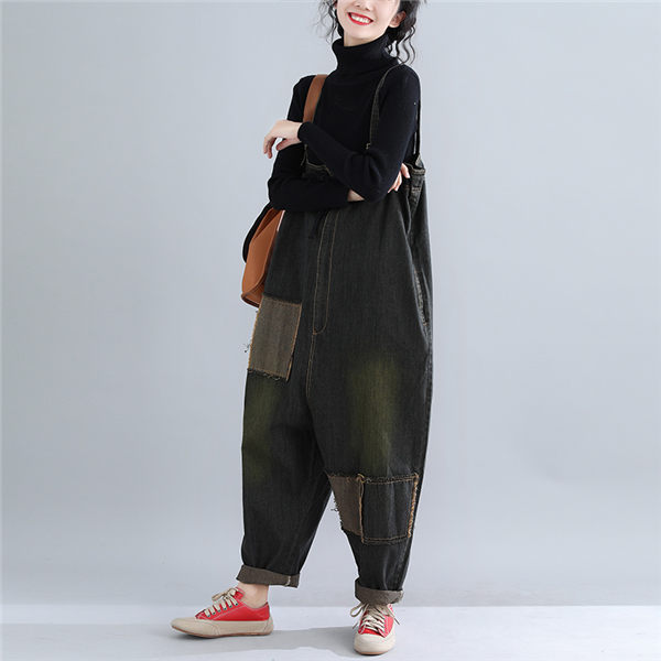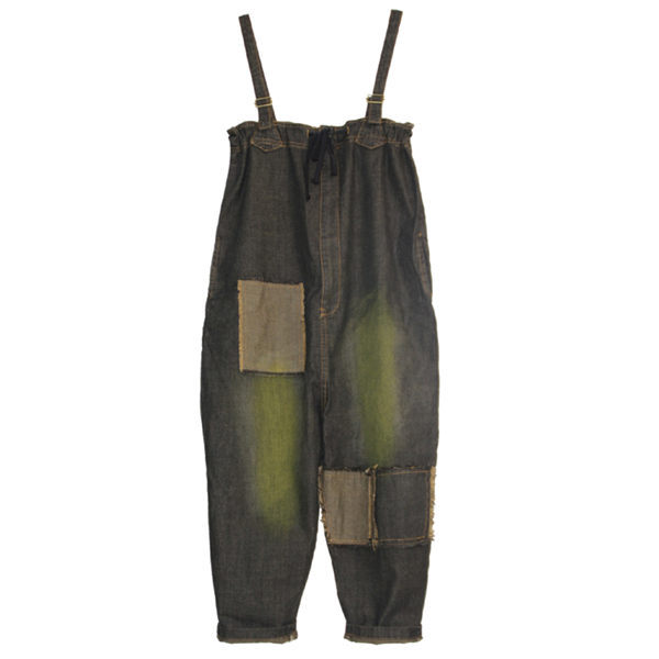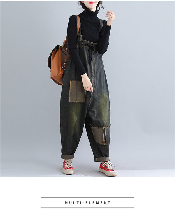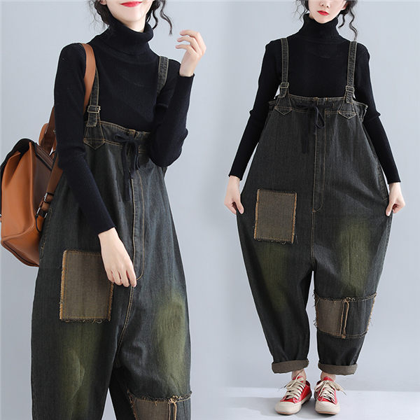 サロペット デニムパンツ レディース デザイン パンチ オーバーオール 九分丈 ヴィンテージ風 デニム おもしろい 体型カバー ゆったり 春夏