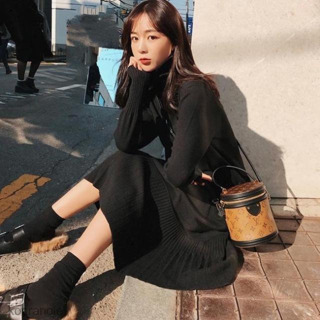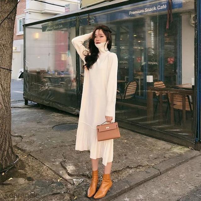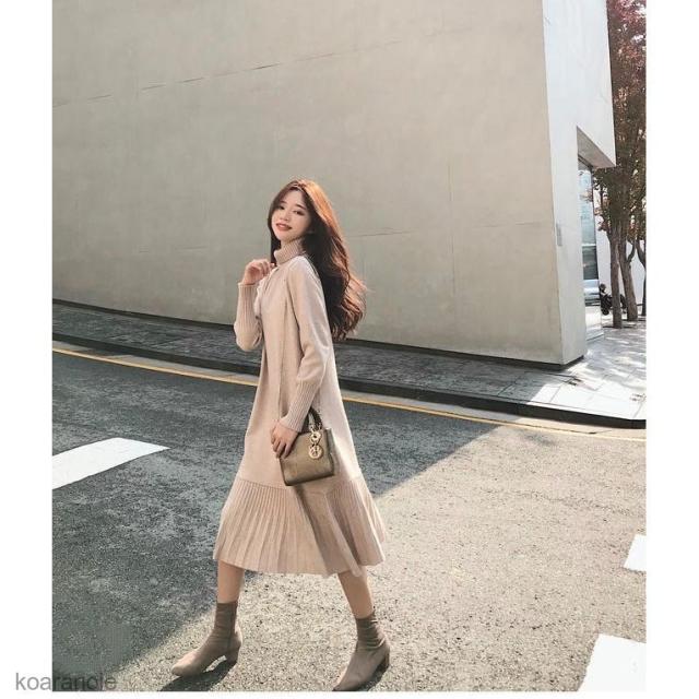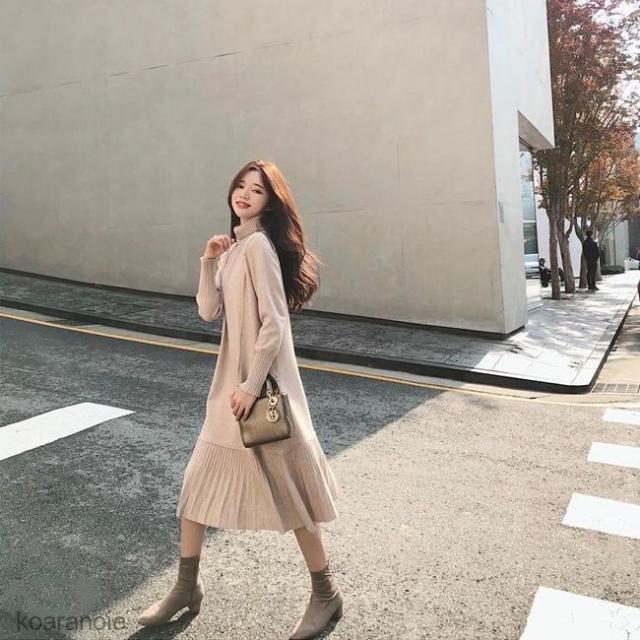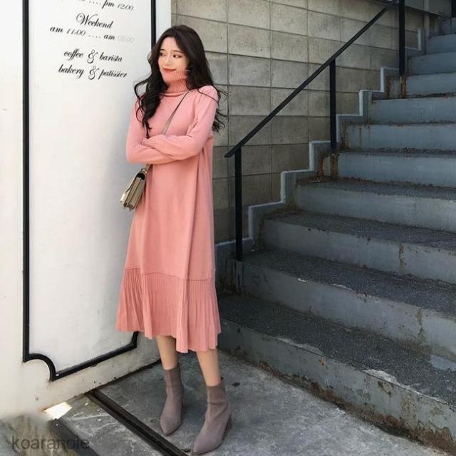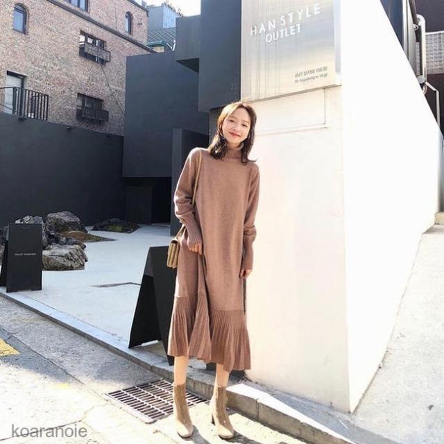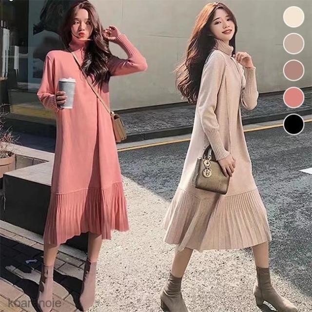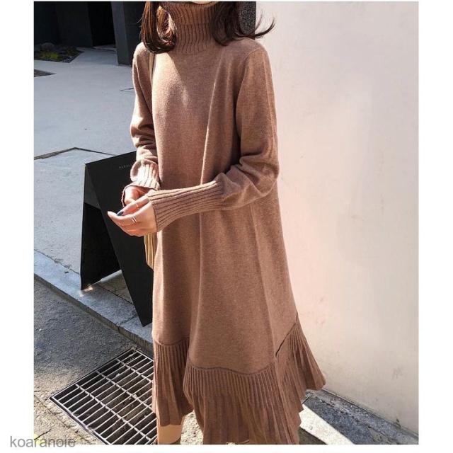 ニットワンピース タートルネック ニットワンピ ロング丈 レディース ワンピース ニット ロングワンピ フレア裾 長袖ワンピース プリーツ裾 秋冬