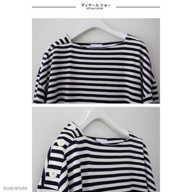 | サイズについての説明 | Tシャツ 長袖 レディース ボーダー柄 カットソー 長袖Tシャツ ゆったり マリンセーラー Tシャツ 縞柄 レトロ ボーダー柄Tシャツ 春秋 ドロップショルダーにゆったりシルエットでカジュアル感もたっぷり 肩部分にキュートな飾りボタンも見逃せないお洒落ポイント 肌に優しいサラサラの素材を使い、着心地的にも申し分無し 人選ばずに着こなせて、ボトムスとのコーデも自由 サイズ(cm) F F 肩幅62 バスト110 袖丈45 着丈65 ご注意:※素人採寸ですので、若干の誤差がございます、ご了承ください。 |