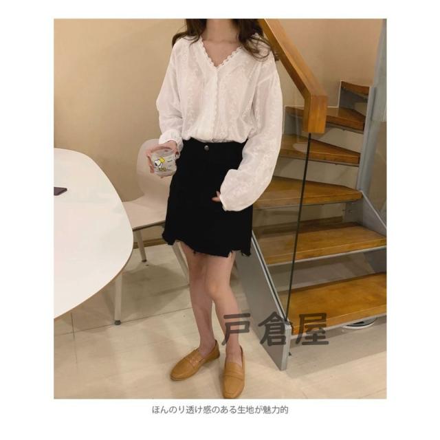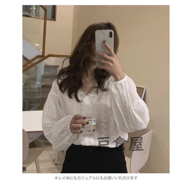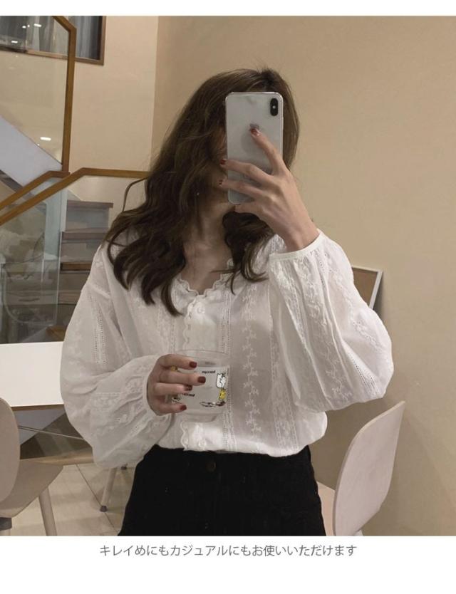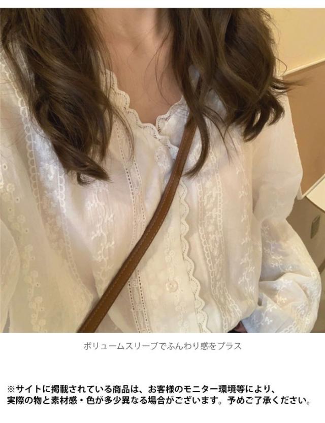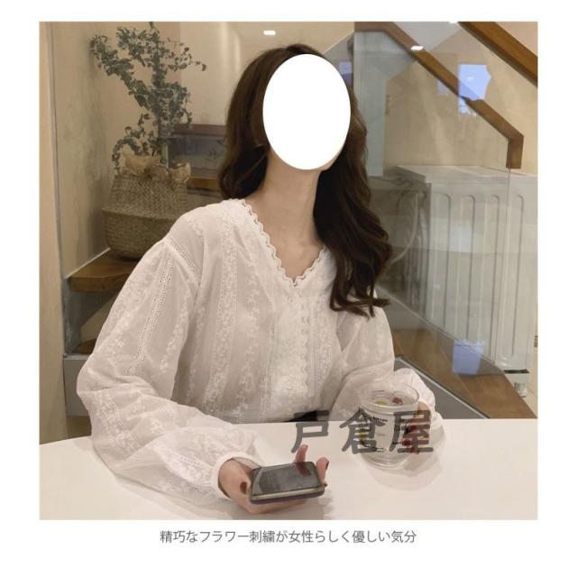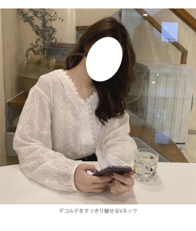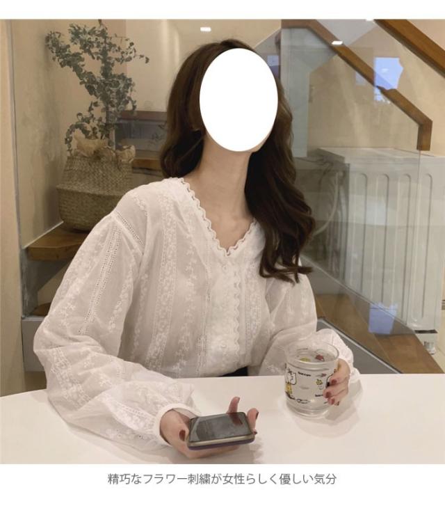 刺繍 レディース ブラウス 刺繍ブラウス 花柄刺繍 フラワー刺繍 レース付き 長袖 透け感 薄手 Vネック ゆったり トップス フェミニン 大人可愛い