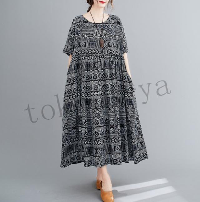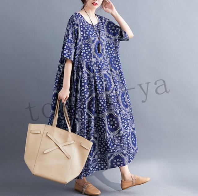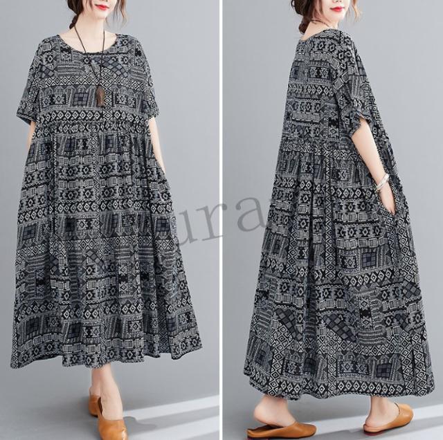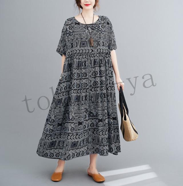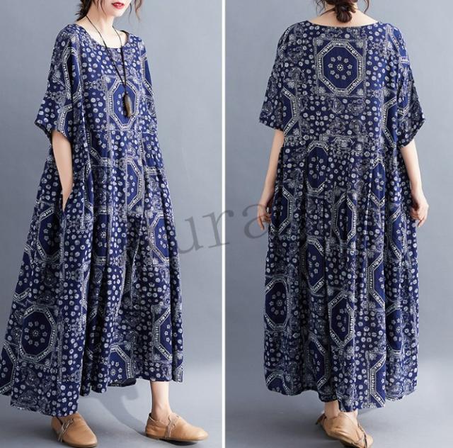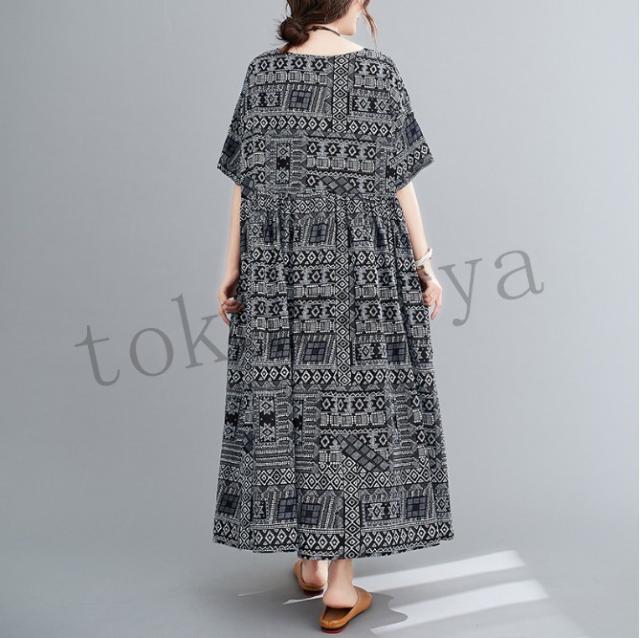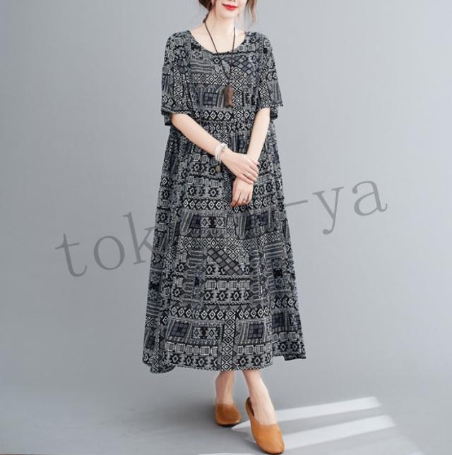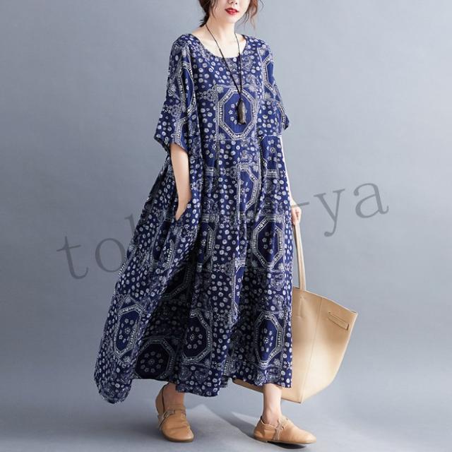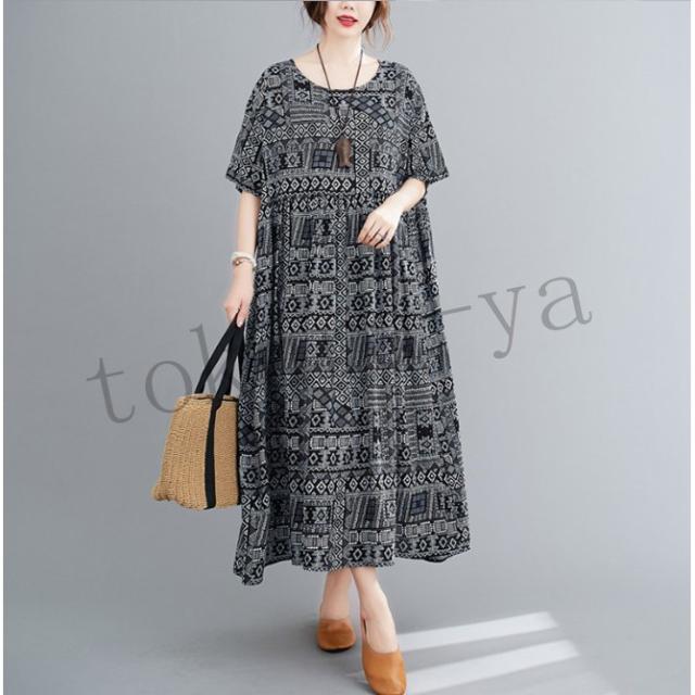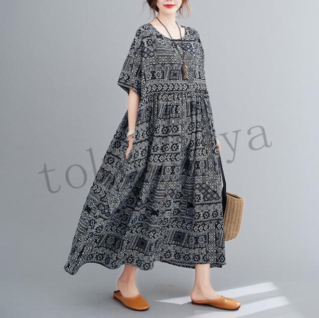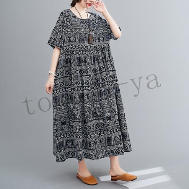 ワンピース レディース コットン 森ガール ナチュラル ゆったり 体型カバー マキシワンピース ロング 半袖 麻 大きいサイズ ボヘミア風 夏
