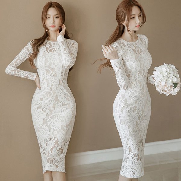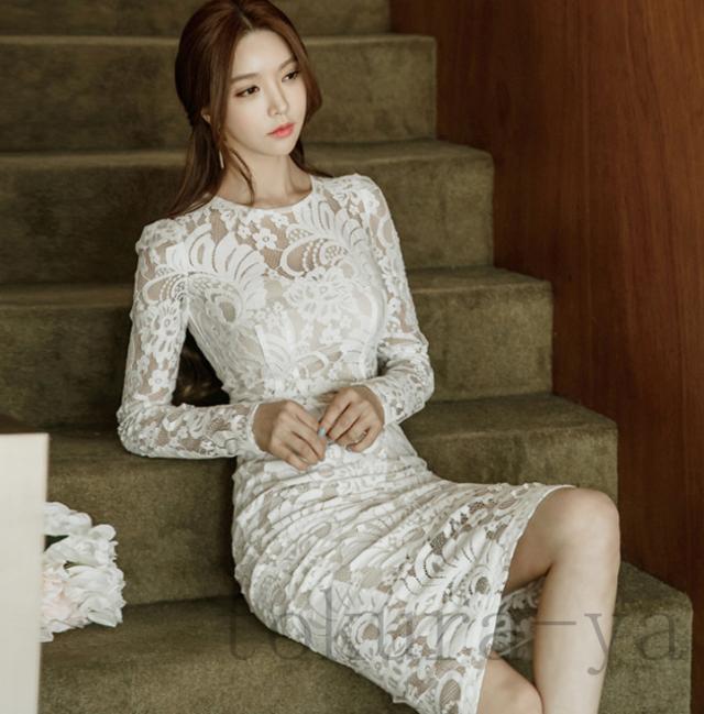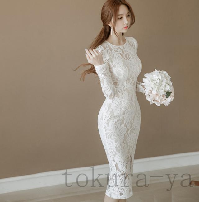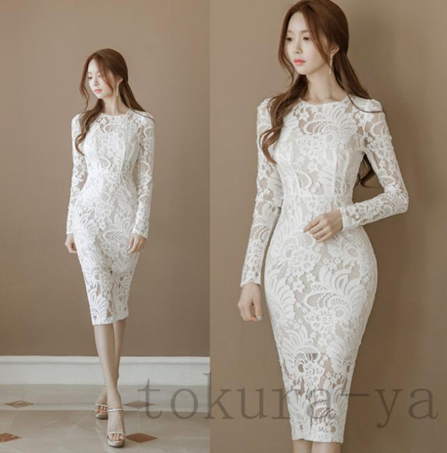 ワンピース レディース 2020 膝丈ワンピース レースワンピース 長袖 丸首 花柄 Aライン ワンピース 腰括れ タイト エレガント 上品 演奏会