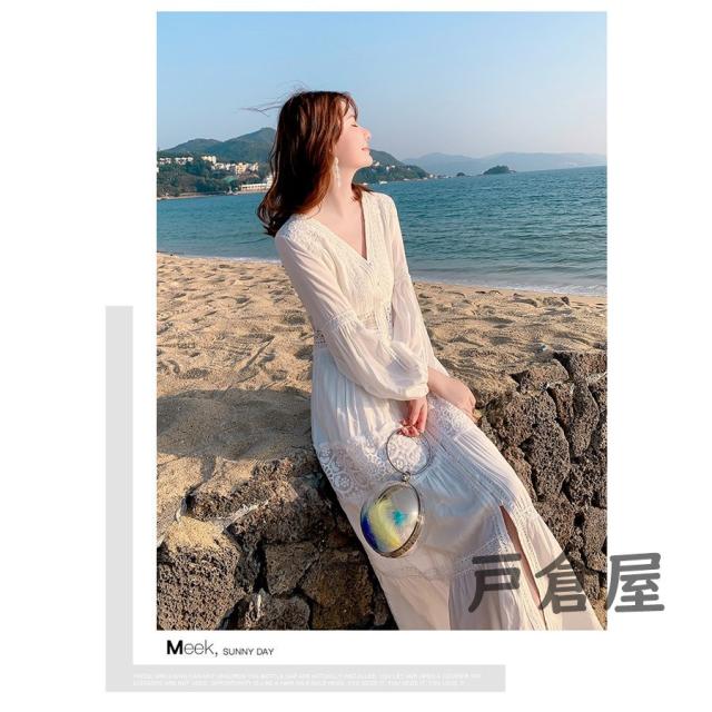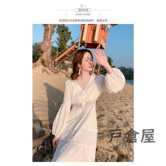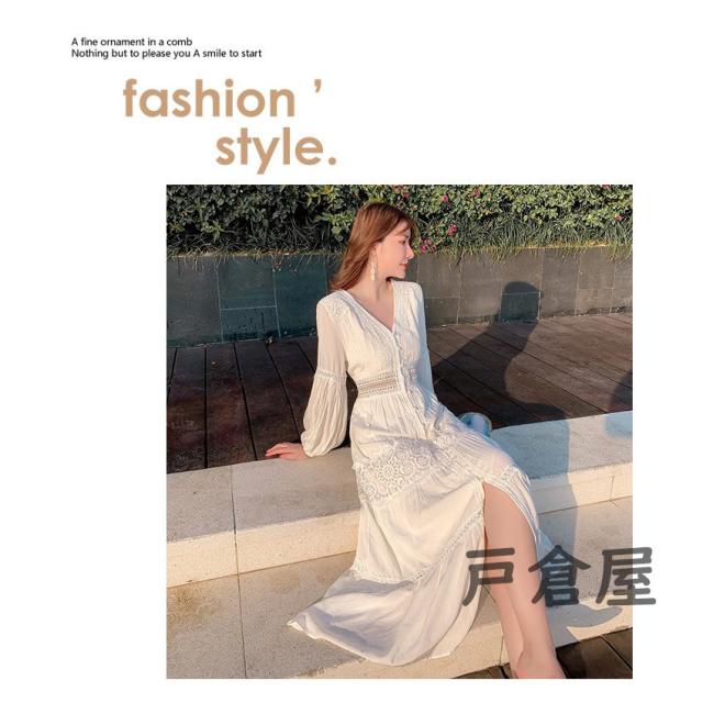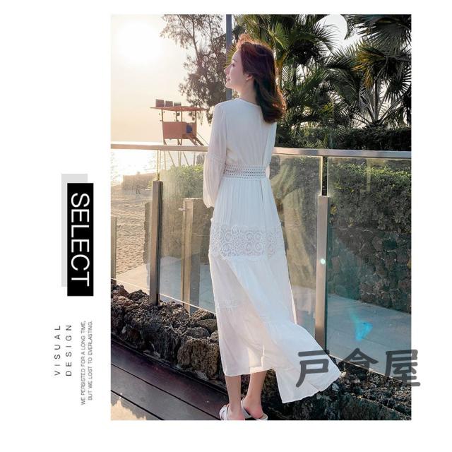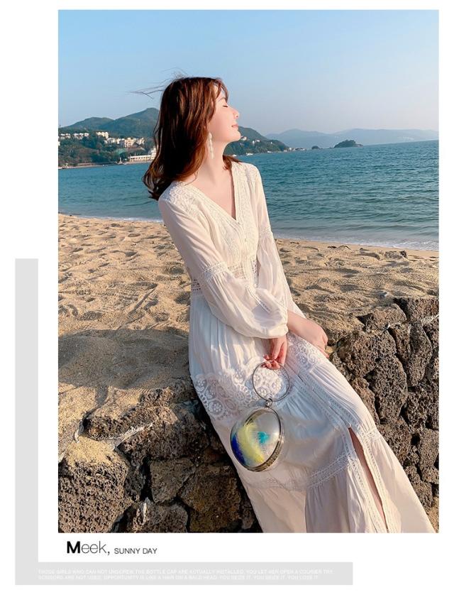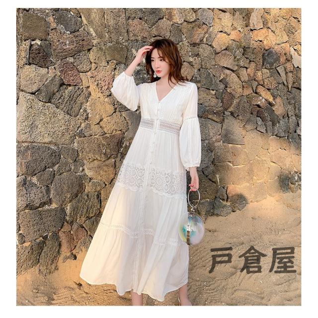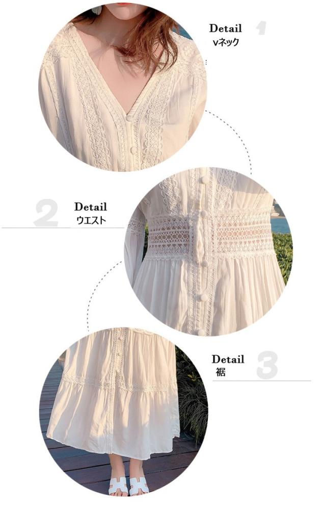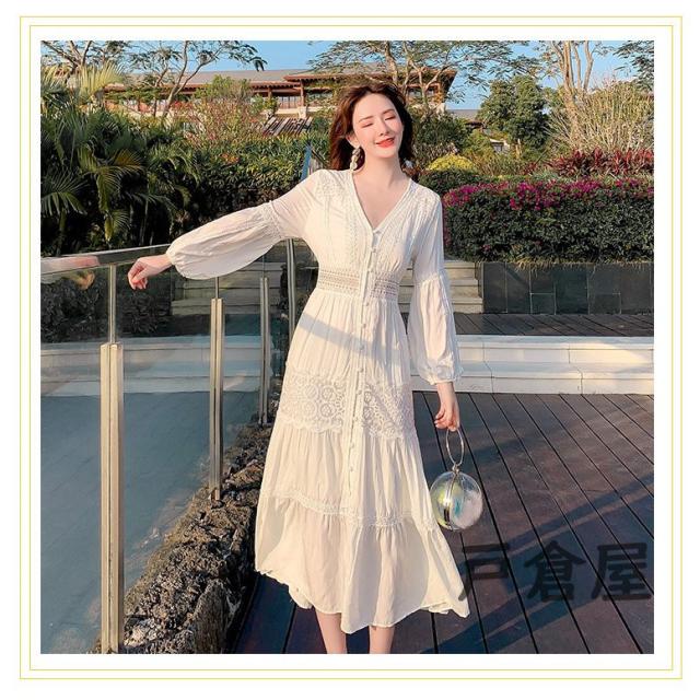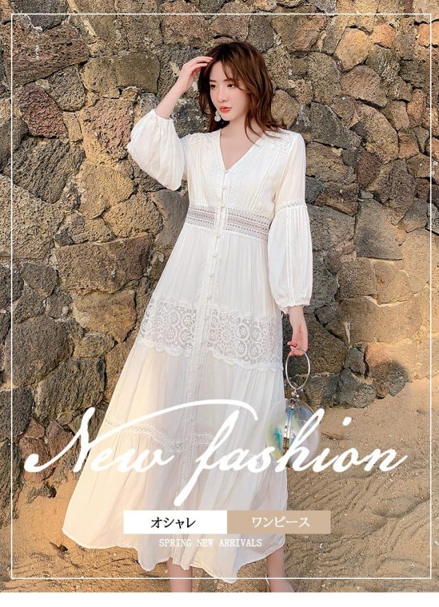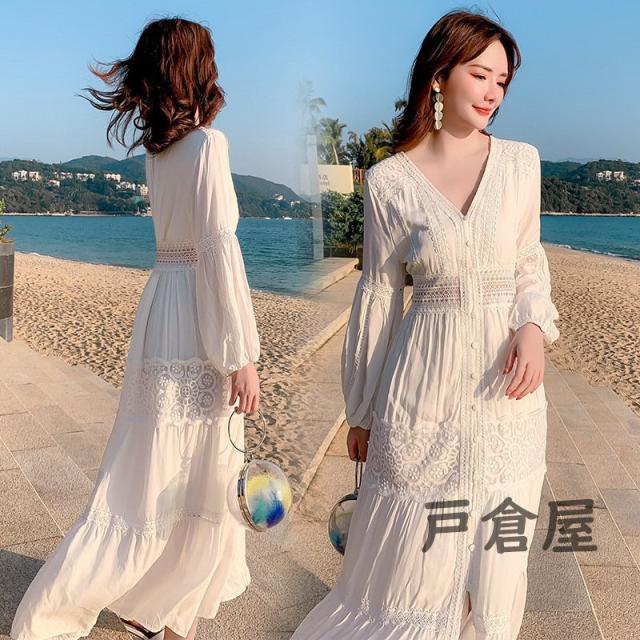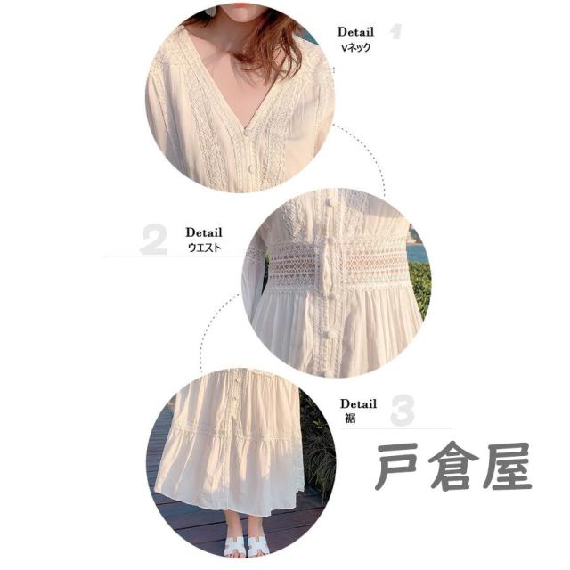 ワンピース レディース 40代 ボヘミアマキシワンピース 春夏 長袖ワンピース 白レース V`ネックロングスカート 結婚式ドレス 大きいサイズ オシャレ 30代 50代