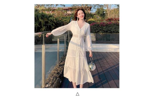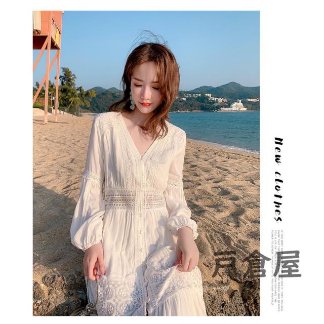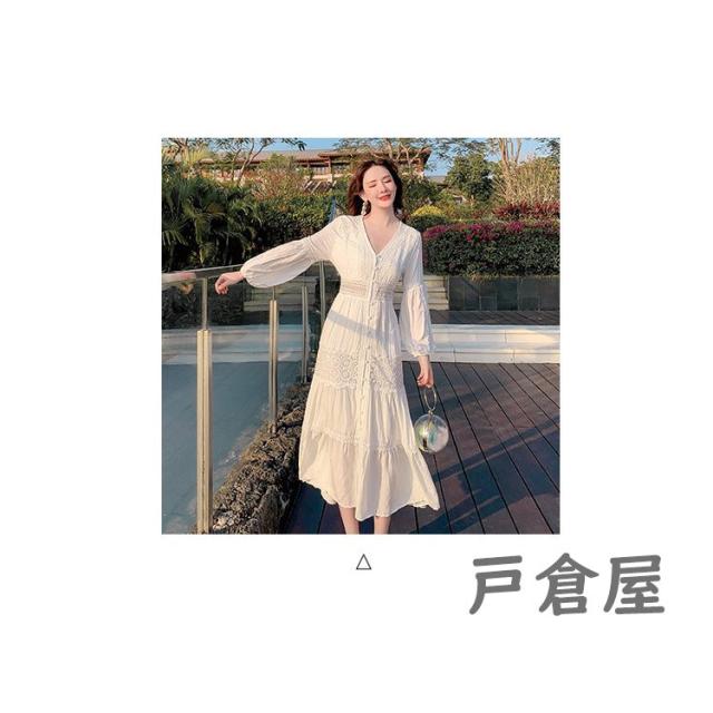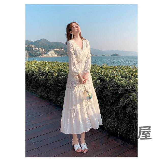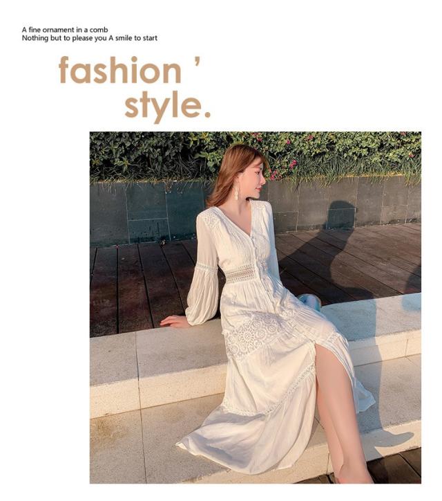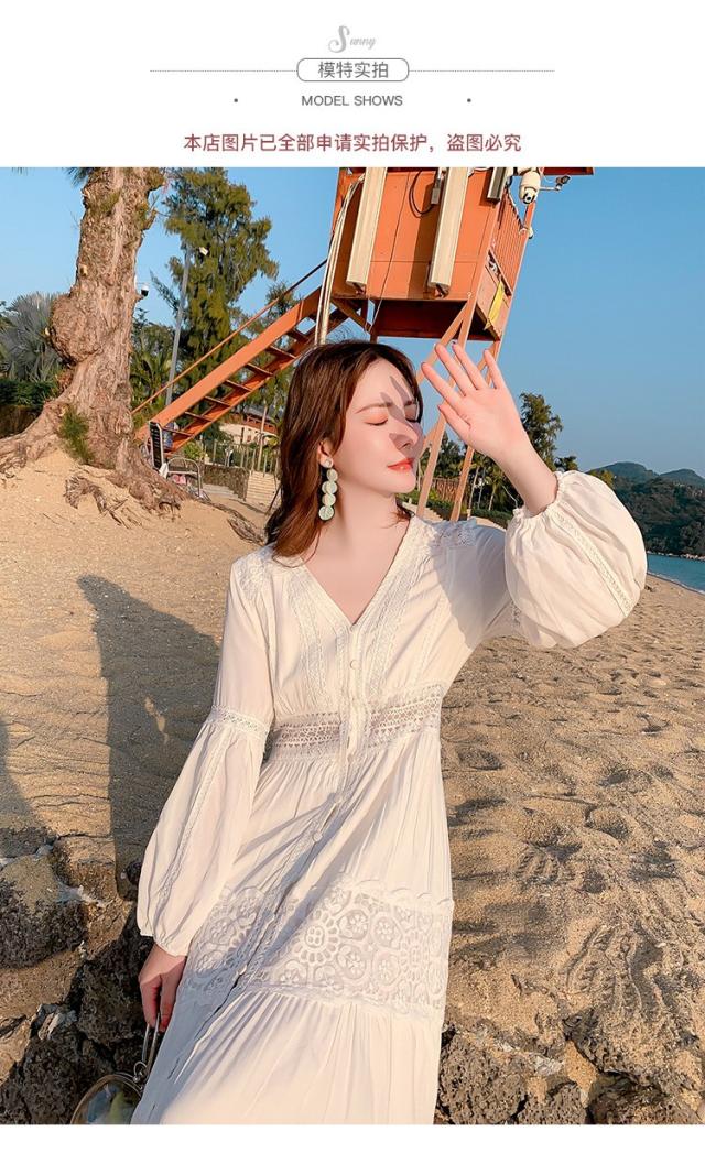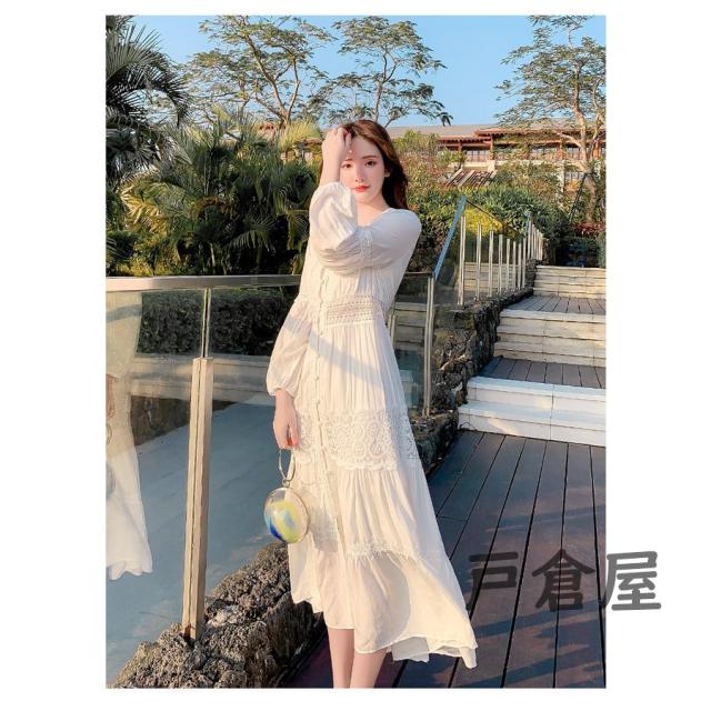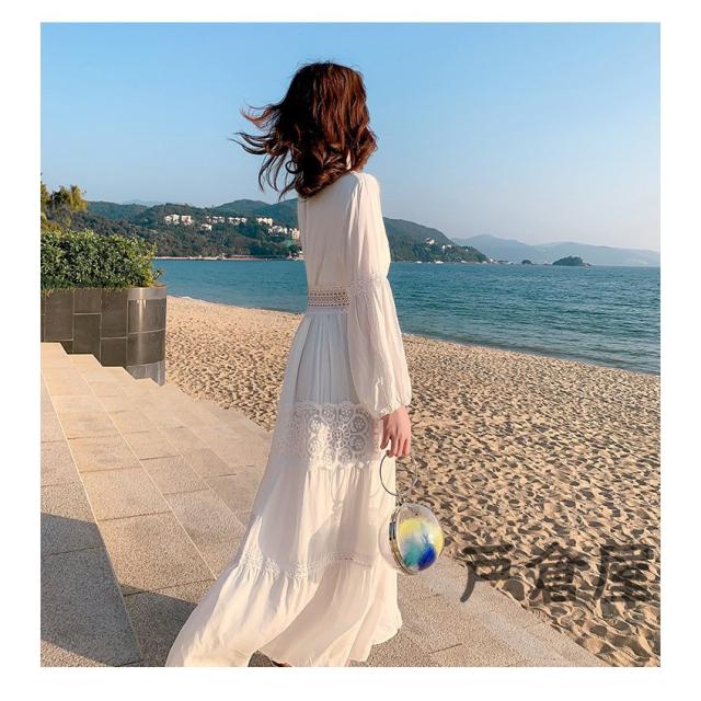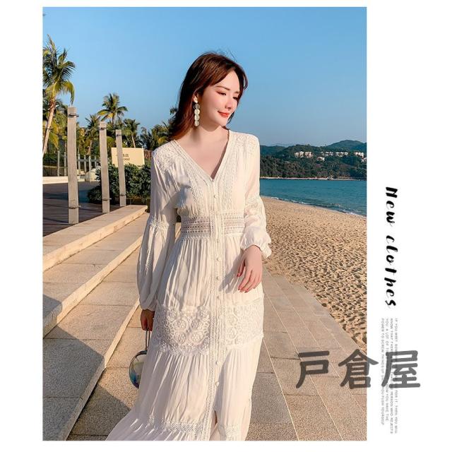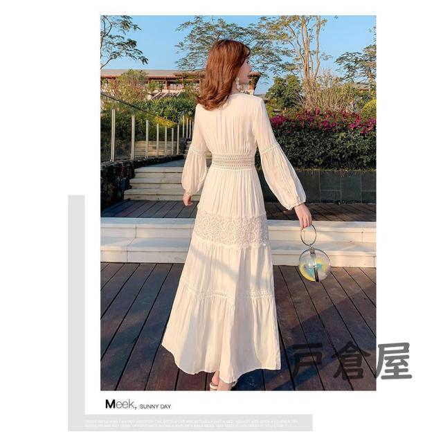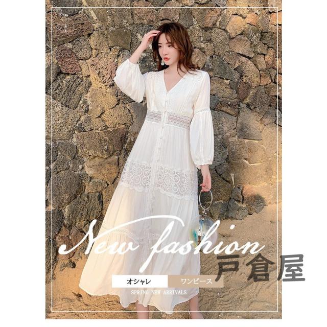 ワンピース レディース 40代 ボヘミアマキシワンピース 春夏 長袖ワンピース 白レース V`ネックロングスカート 結婚式ドレス 大きいサイズ オシャレ 30代 50代