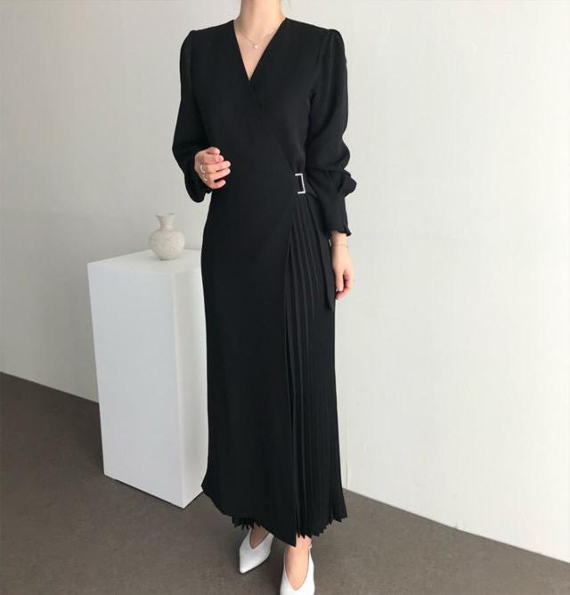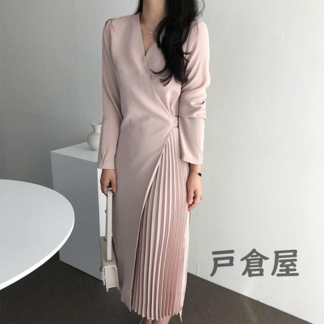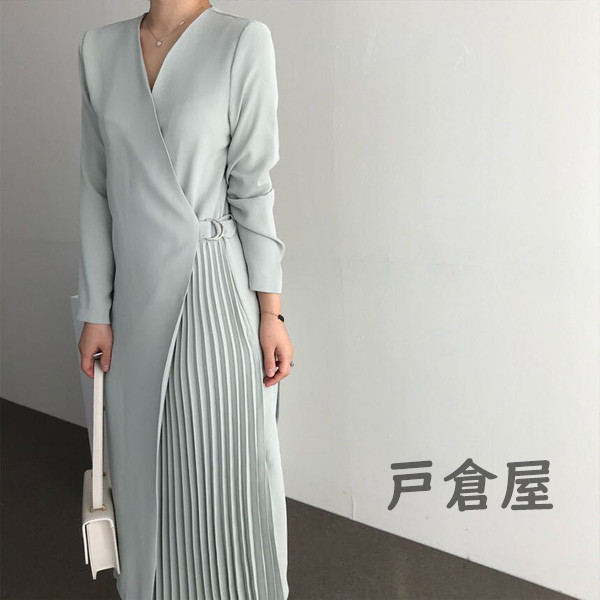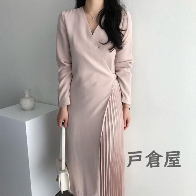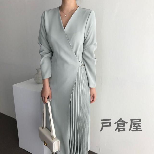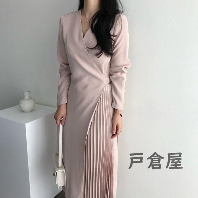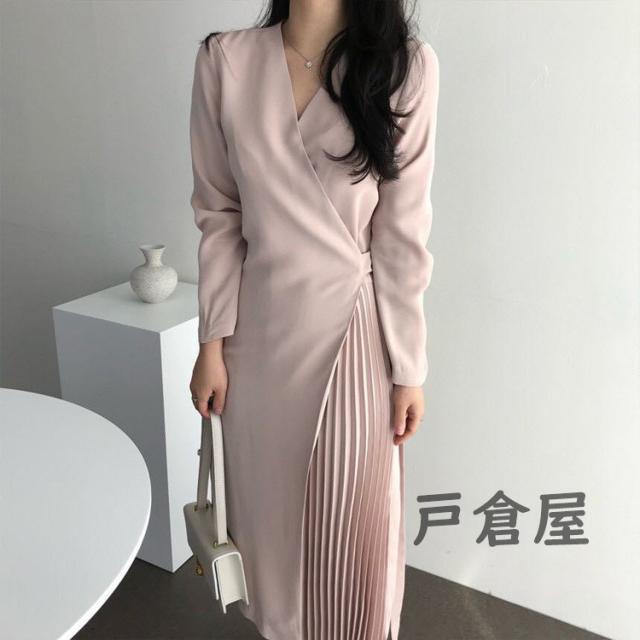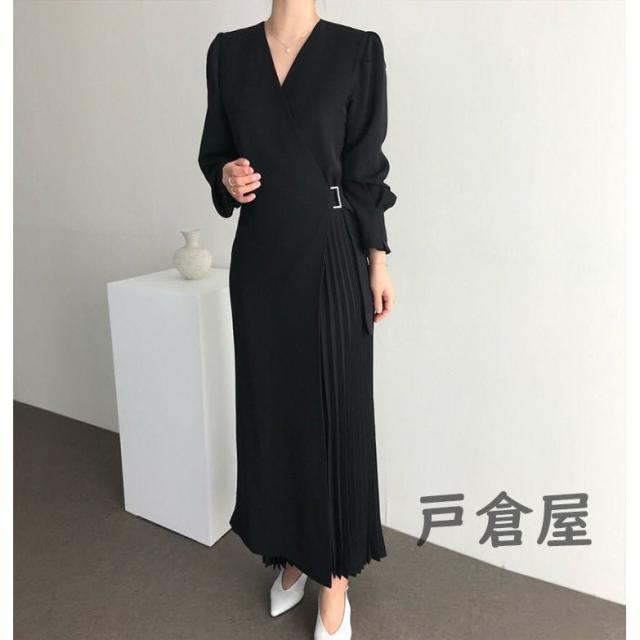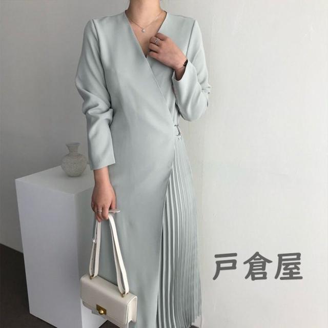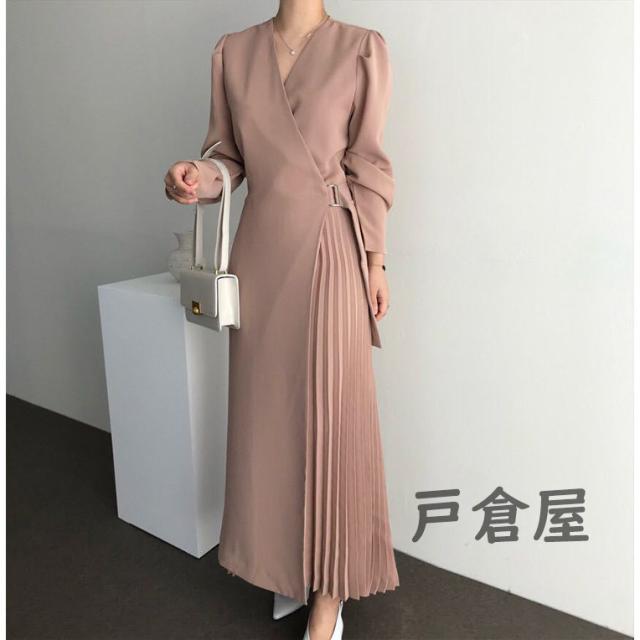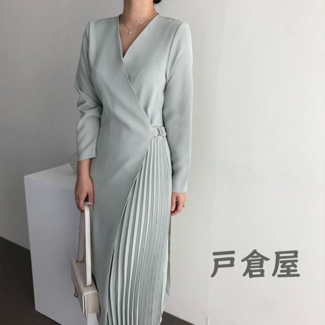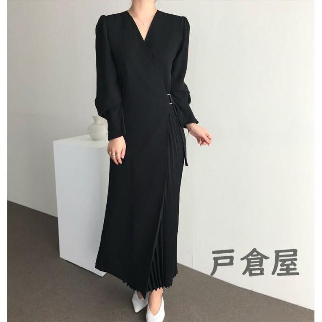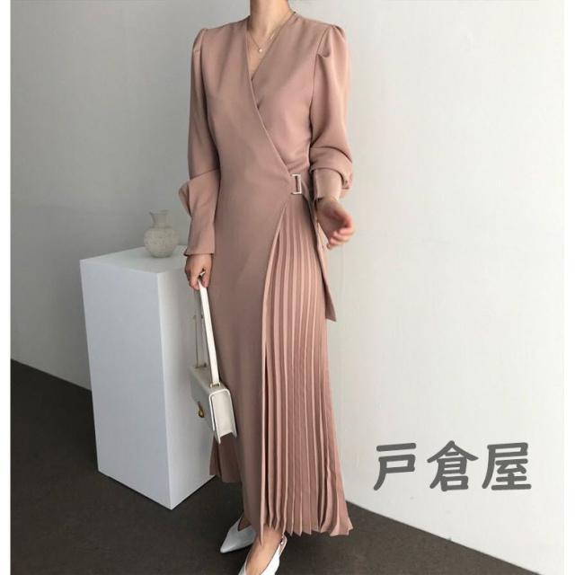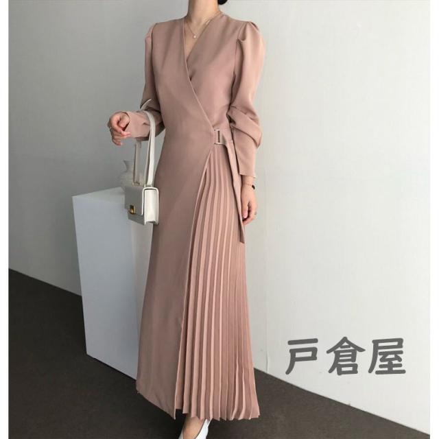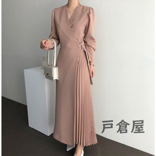 シャツワンピース レディース 40代 キレイめ マキシワンピース 秋冬 長袖ワンピース 無地 Vネック プリーツスカート オシャレ韓国風 体型カバー30代 50代