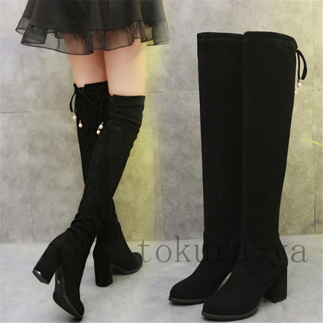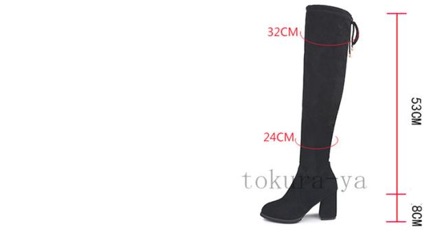 ニーハイブーツ ストレッチ レディース スエード調 ハイヒール ヒール8cm バックリボン チャンキーヒール 大きいサイズあり 太ヒール ロング 美脚