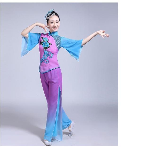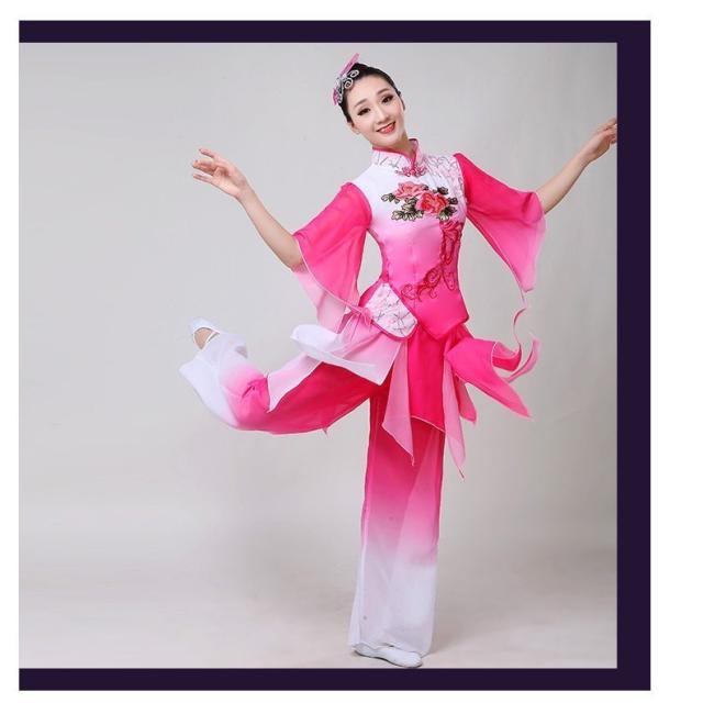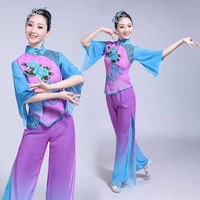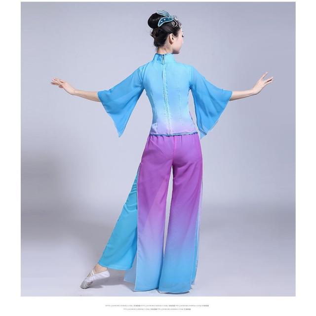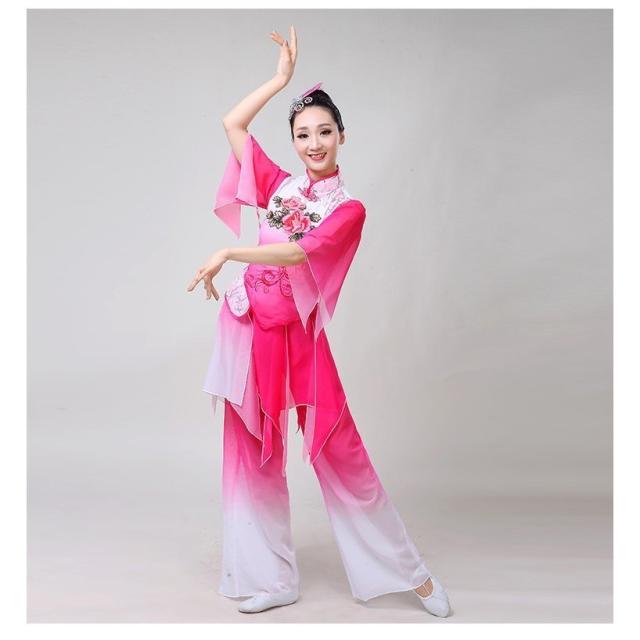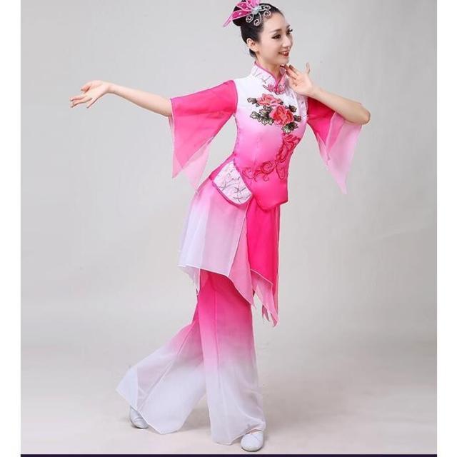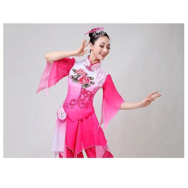 チャイナドレスセットアップダンス衣装 古典ダンス 傘ダンス 扇子ダンスステージ衣装 花刺繍 2色トップス+シフォンワイドパンツ 演出服
