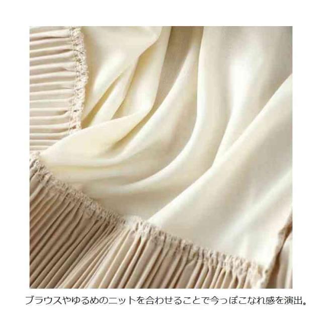 | これ1枚でパッと映えるスカート。 裾からのぞくプリーツで誰もが振り向く注目コーデの完成? 歩くたびにプリーツ部分が揺れ動き、女性らしい印象をプラスしてくれます! ウエストすっきりのフレアシルエット。 ブラウスやゆるめのニットを合わせることで今っぽこなれ感を演出。 | |