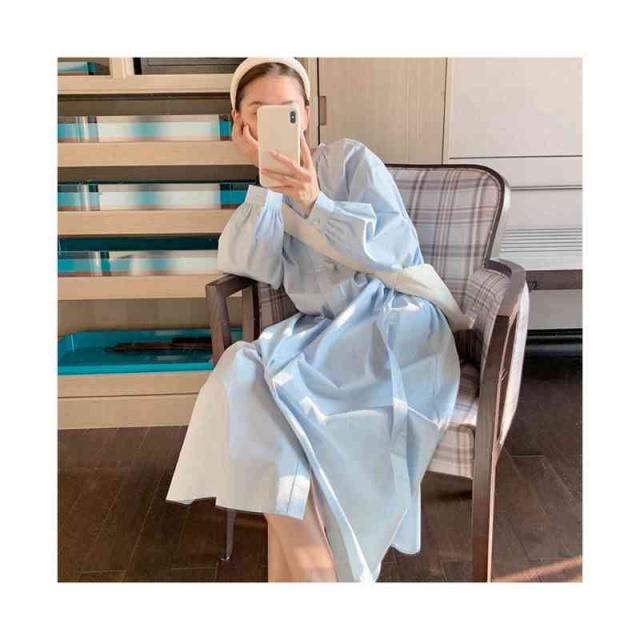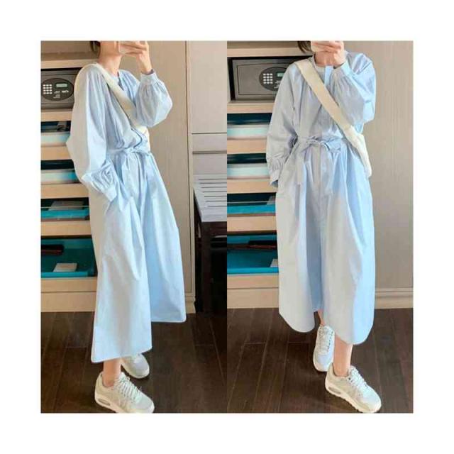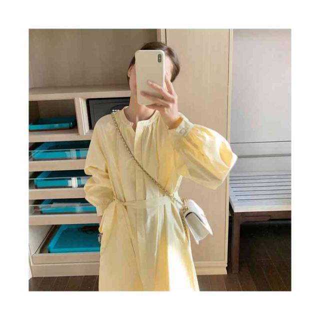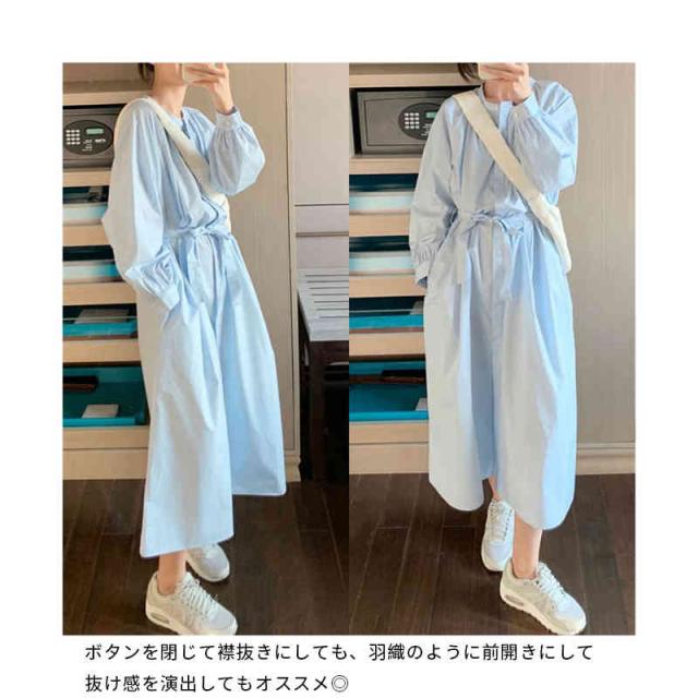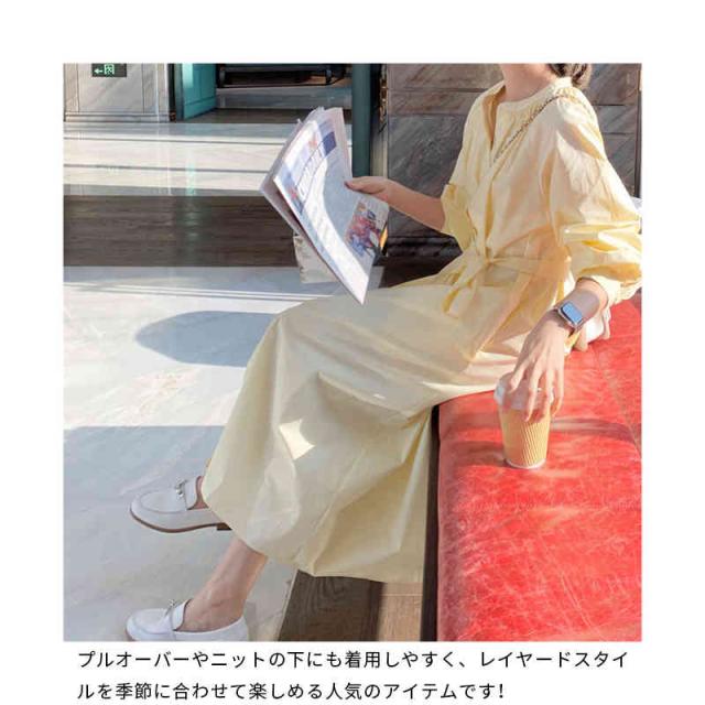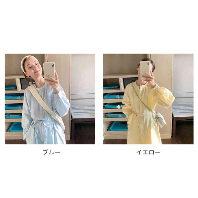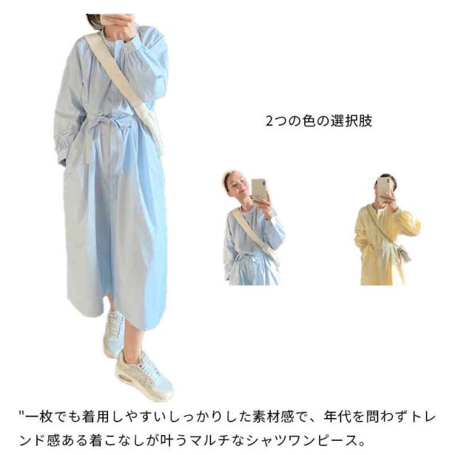 送料無料 2ways ワンピース シャツワンピース コットン バンドカラー ロング丈 ブルー イエロー ボタン ギャザー ベルト付き 紐付き ひも コート 前開き シンプル 無地 カジュアル 春夏 春服 春物 20代 30代 40代