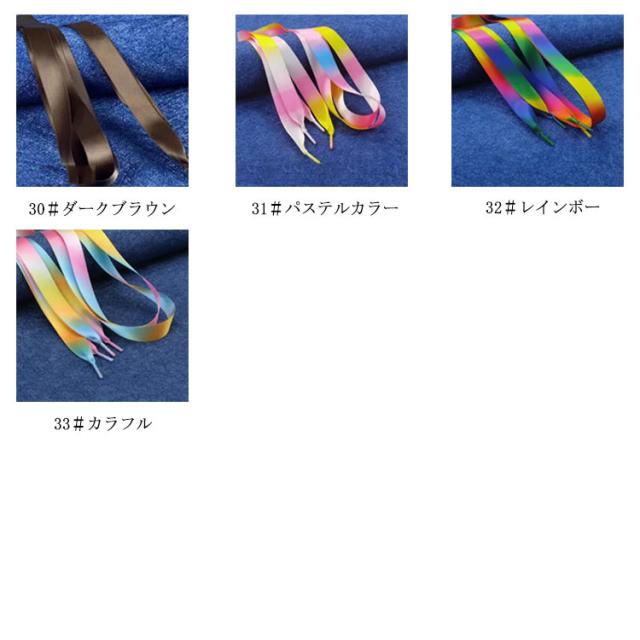 | サテンリボンシューレースです。 靴のイメージを変えたり、ヘタってしまったシューレース(靴ひも)の替えにも♪ 上から穴1・2つ開けて結ぶと、リボン結びの強調できる長さになります。 スタイルや好みによって、色を変えて個性を出してください。 | |