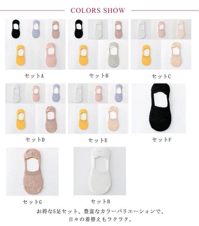 | 毎日使える!嬉しいフットカバー5足セット 滑り止めをかかと周りに施し、脚にしっかりフィット!脱げにくく快適な履き心地。 フットカバー型なので、外から見えづらく、スニーカーやパンプス、スリッポンなどと合わせやすい。 薄手の生地で、アッパー部分はメッシュデザイン、汗をかきやすい季節でも快適です。 お得な5足セット、豊富なカラーバリエーションで、日々の着替えもラクラク。 | |
