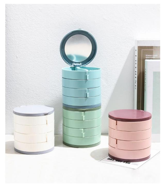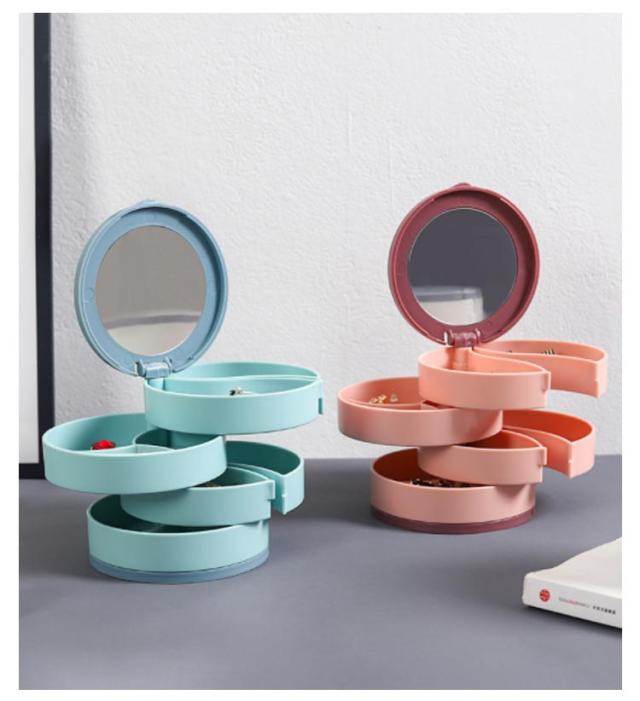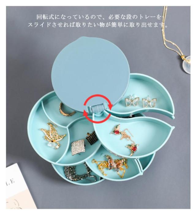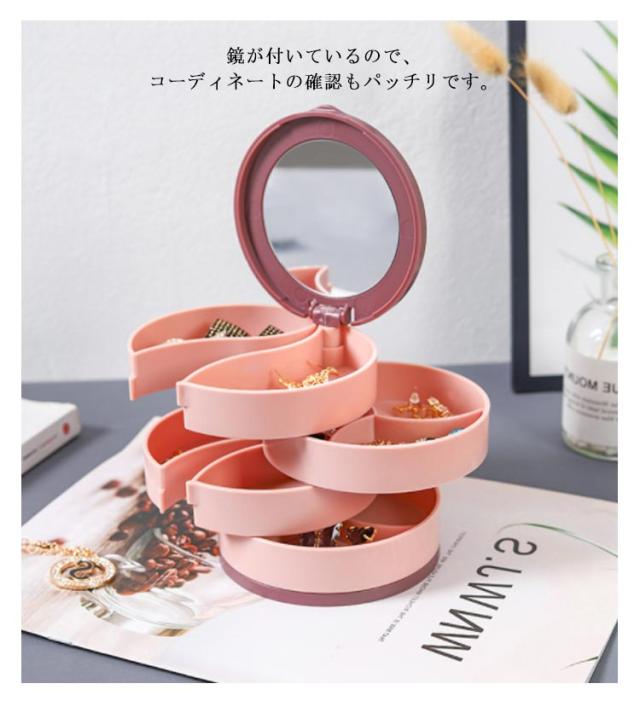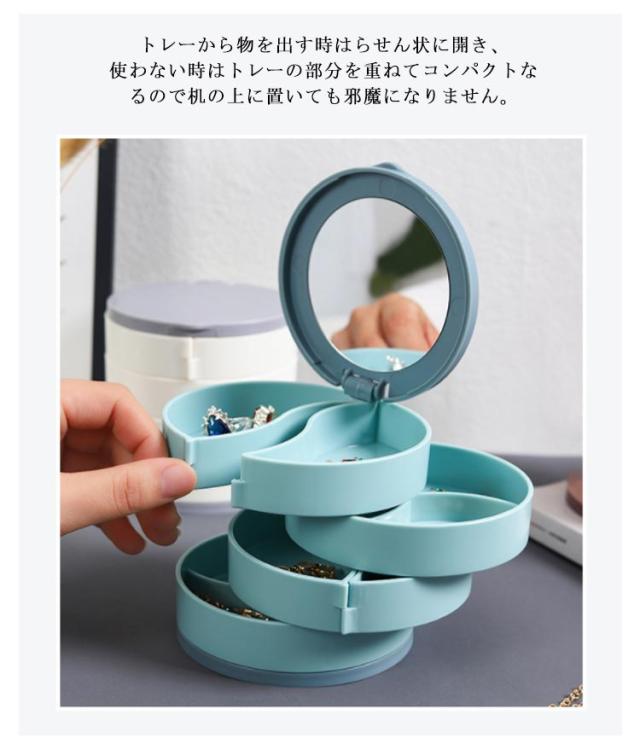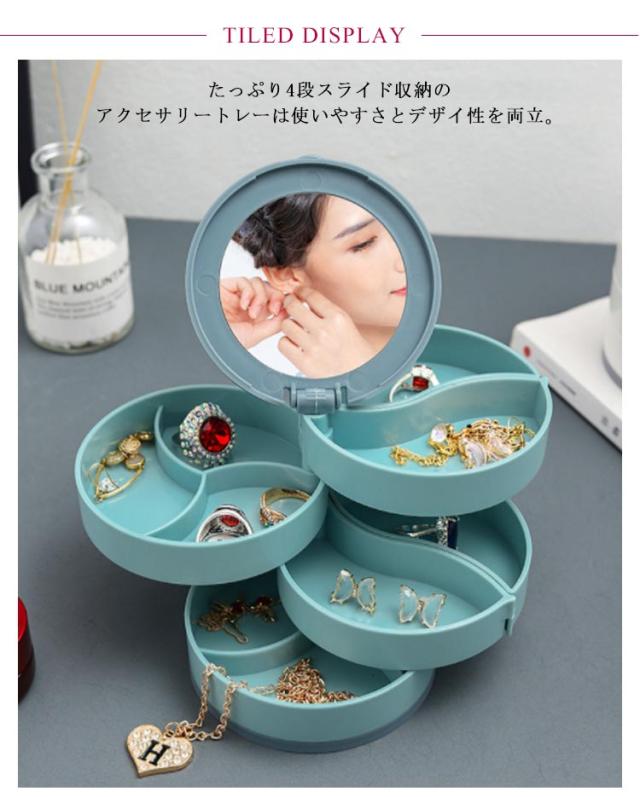 | コンパクト、キレイに収納できるアクセサリートレー たっぷり4段スライド収納のアクセサリートレーは使いやすさとデザイ性を両立。 回転式になっているので、必要な段のトレーをスライドさせれば取りたい物が簡単に取り出せます。トレーから物を出す時はらせん状に開き、使わない時はトレーの部分を重ねてコンパクトなるので机の上に置いても邪魔になりません。 鏡が付いているので、コーディネートの確認もパッチリです。 底部は滑り止め加工を施されて、グラグラしませんので安定感抜群。 | |