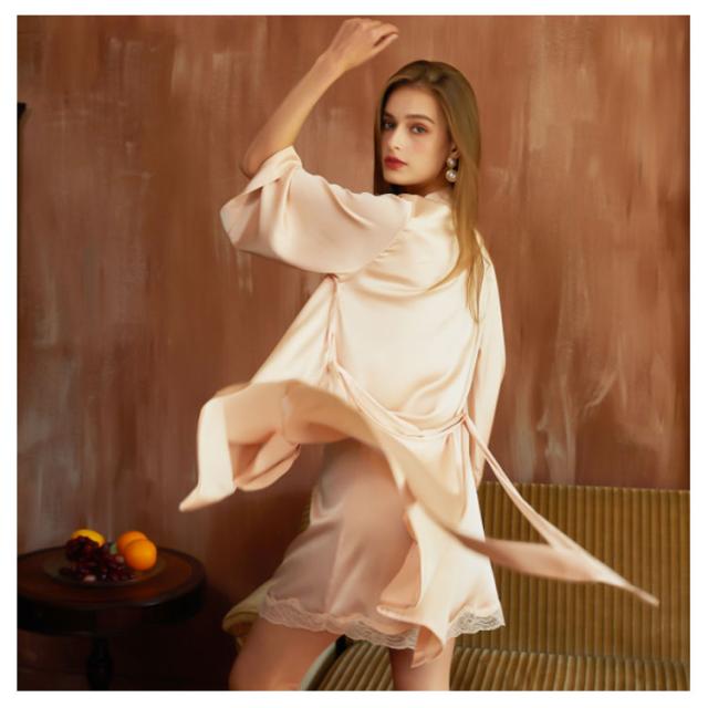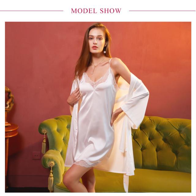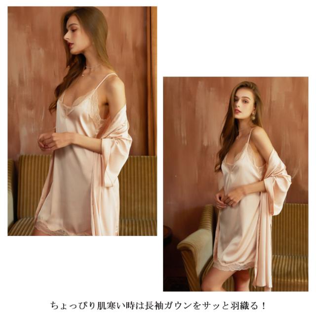 | 春夏にさらっと着られる薄手生地パジャマセット Vネックデザイン、首がすっきり長く見え着れば小顔、着やせ効果があります。 締め付け感がほとんどない楽ちんな着心地◎ バスト・裾回り部分はレース付き、女性のフェミニンな魅力を引き出してくれます。 肩紐の長さは身長に合わせてアジャスターで調節可能です。 ちょっぴり肌寒い時は長袖ガウンをサッと羽織る! | |