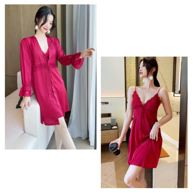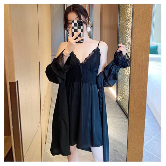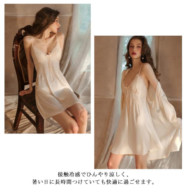 ガウン キャミソール 体型カバー レース 【送料無料】パジャマ 2点セット キャミワンピ 部屋着 透け感 ワンピース 可愛い 秋 お洒落 薄手 ゆったり 寝巻き リラックス エレガント セクシー ガーリー フェミニン 大人 ウエストマーク 無地 春 夏 レディース