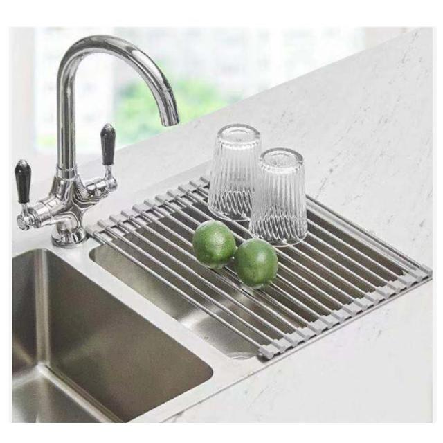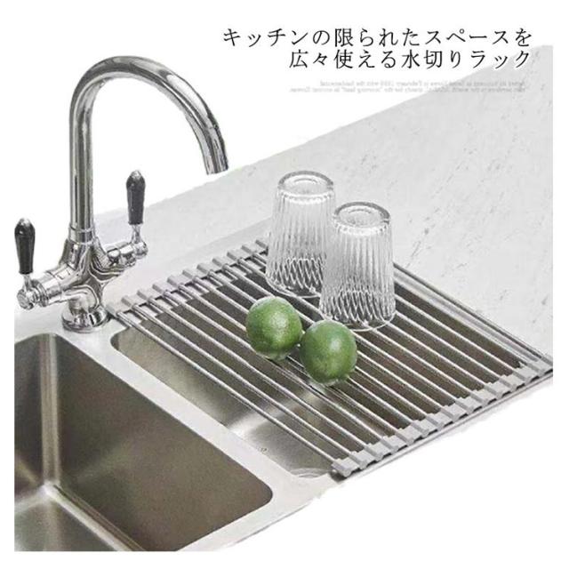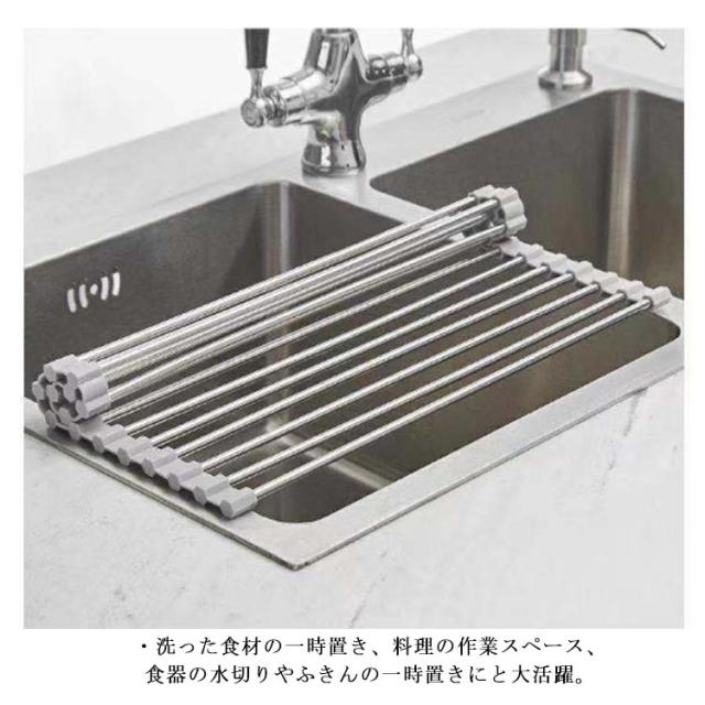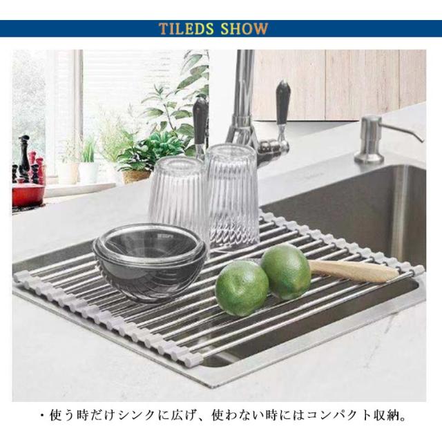 | キッチンの限られたスペースを広々使える水切りラック ・使う時だけシンクに広げ、使わない時にはコンパクト収納。 ・洗った食材の一時置き、料理の作業スペース、食器の水切りやふきんの一時置きにと大活躍。 | |