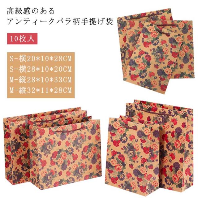 | 高級感のあるアンティークバラ柄手提げ袋 10枚入 プレゼントを入れたり、お部屋に飾ったり、荷物を持ち歩いたり! 様々なものが入れられて便利!! ギフト用にもピッタリです。 自慢したくなっちゃう紙袋♪ | |