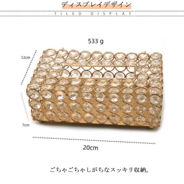 | デラックス、おしゃれなキラキラのティッシュケース。 ごちゃごちゃしがちなスッキリ収納。 部屋にも、使いやすい場所にティッシュを収納できます。 ティッシュの取り換えは簡単、替えティッシュを入れるだけ。 リビング、洗面所、バスルーム、トイレ、キッチンなど使う場所を選びません。 日常の家庭生活に彩りを添えます。 | |