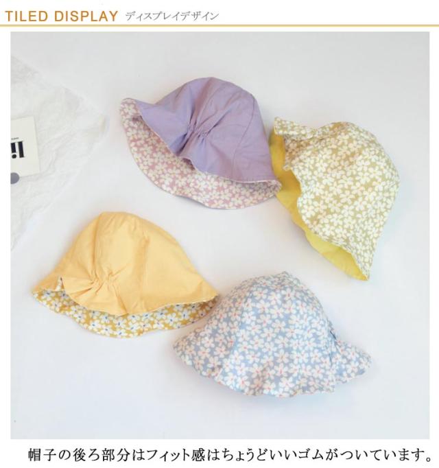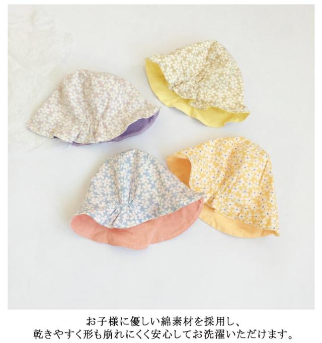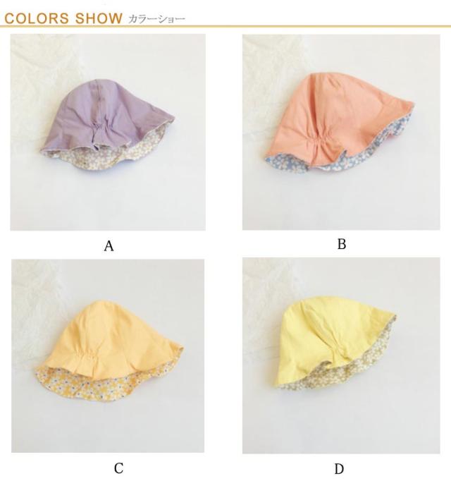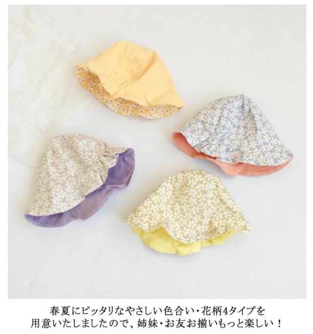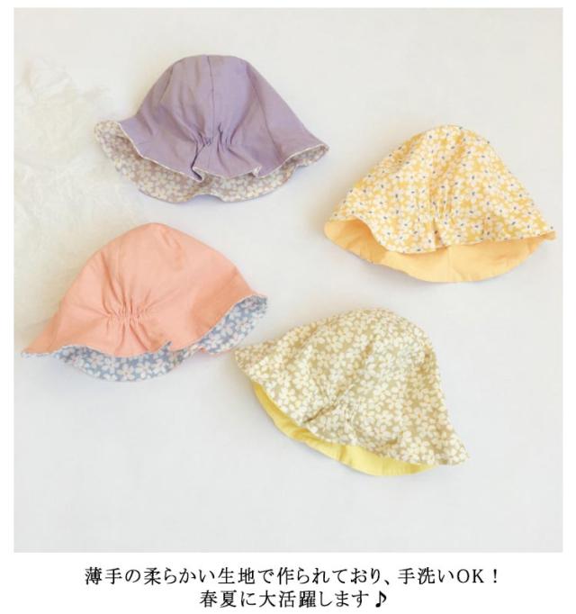 | 両面可用!春夏にピッタリな花柄キッズ帽子 帽子の後ろ部分はフィット感はちょうどいいゴムがついています。 薄手の柔らかい生地で作られており、手洗いOK!春夏に大活躍します♪ お子様に優しい綿素材を採用し、乾きやすく形も崩れにくく安心してお洗濯いただけます。 春夏にピッタリなやさしい色合い・花柄4タイプを用意いたしましたので、姉妹・お友お揃いもっと楽しい! | |