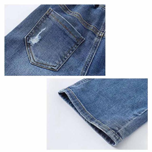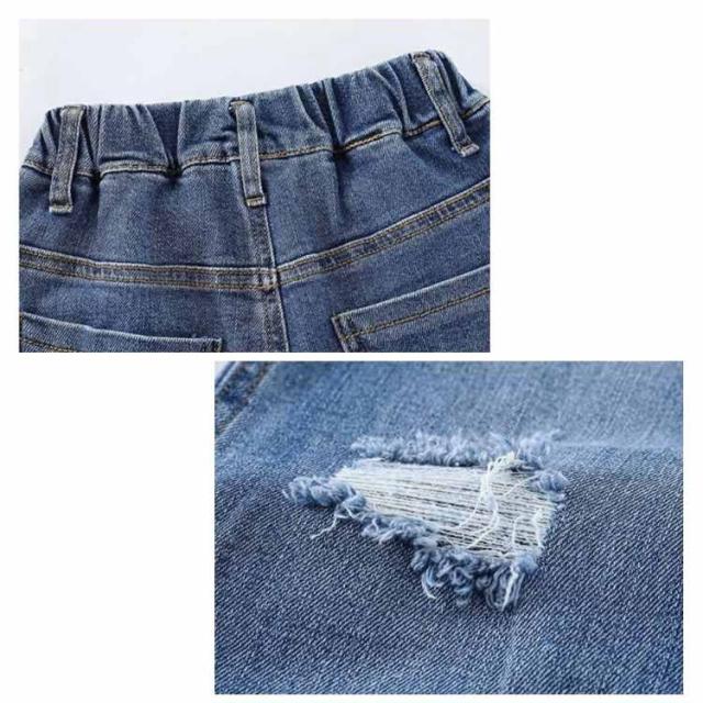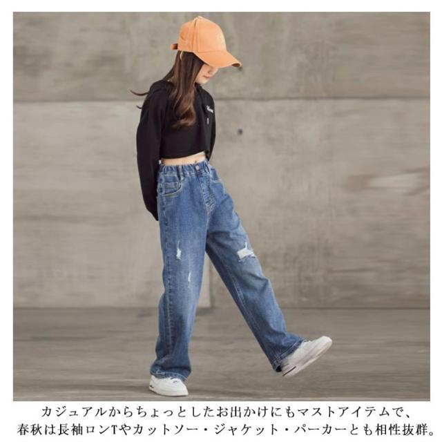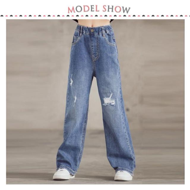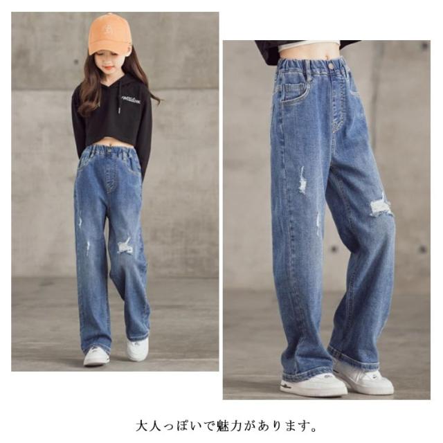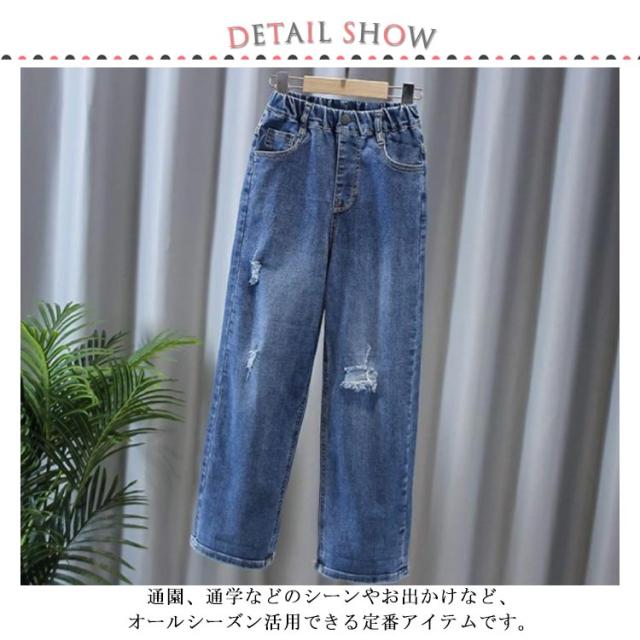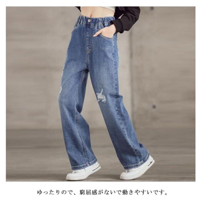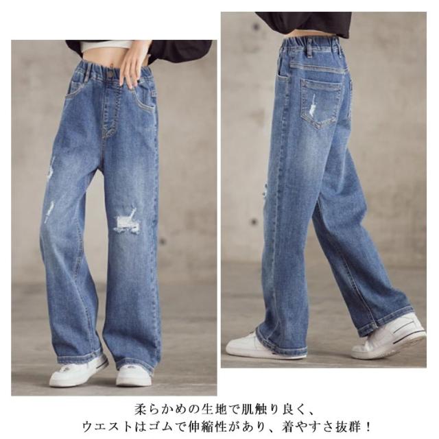 小学生 女の子 キッズ デニム ジーパン パンツ ストレートパンツ ダメージ 幅広 女の子 女児 ウエストゴム ジュニア 長ズボン こども おしゃれ ワイドパンツ 春 夏 秋 110cm 120cm 130cm 140cm 150cm 女児