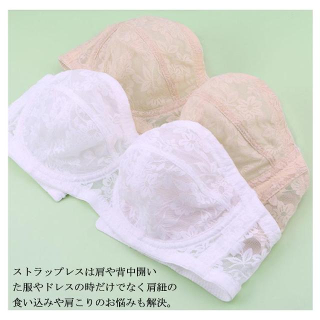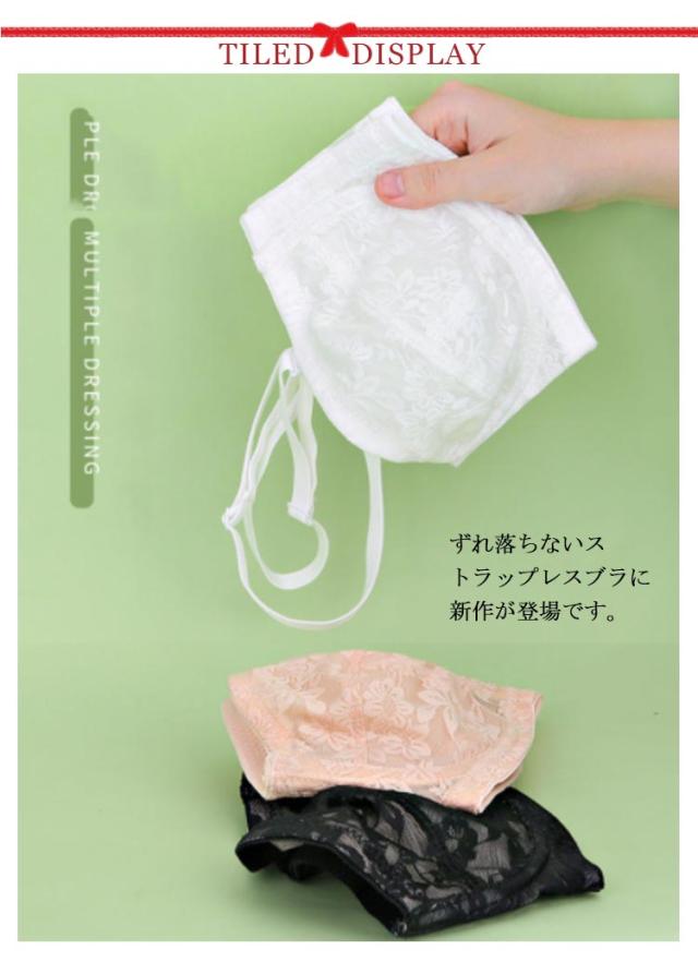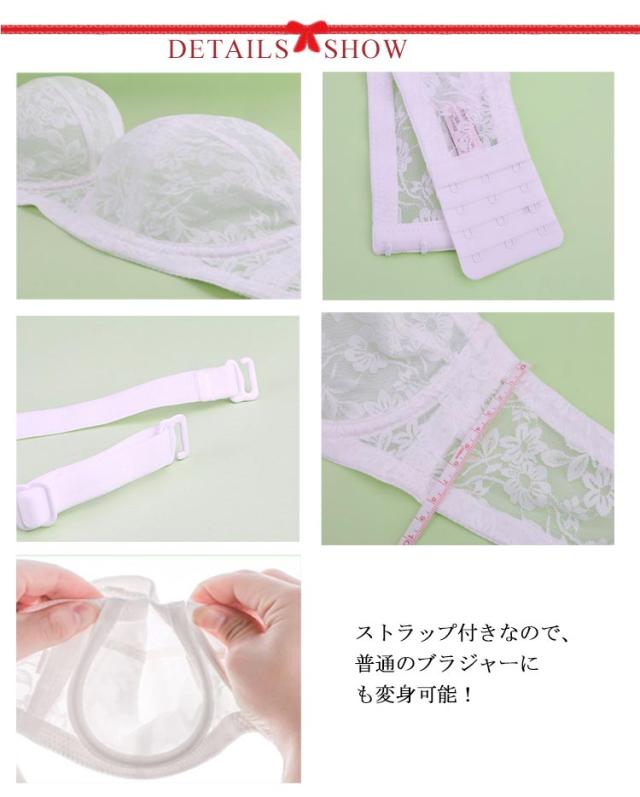 | 肩や胸元のあいたドレスに絶対おすすめ! ずれ落ちないストラップレスブラに新作が登場です。 かわいいレースデザイン、胸を小さく見えるストラップレスブラ。 薄手レース素材を使用、綺麗なシルエットにカップ部分は柔らか素材で通気性があり汗ばむ季節も快適。 ストラップレスは肩や背中開いた服やドレスの時だけでなく肩紐の食い込みや肩こりのお悩みも解決。 オフショルダー、キャミソール、どんな装いにも合わせやすく、幅広いシーンで大活躍するストラップレスブラジャー。 ストラップ付きなので、普通のブラジャーにも変身可能! オンにもオフにも使える万能ブラです。 | |
