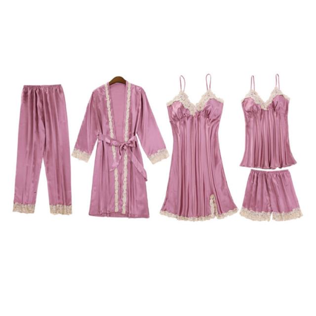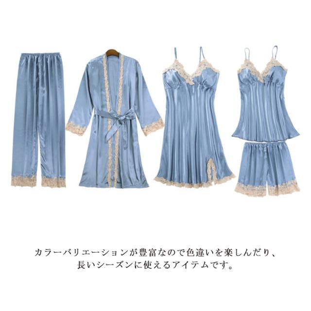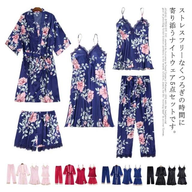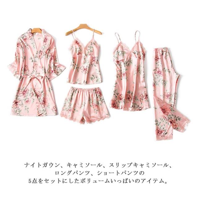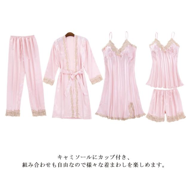 ロングパンツ セット 送料無料 サテン 5点セット 部屋着 パジャマ キャミソール レディース ナイトガウン ショートパンツ セクシー ランジェリー カップ付き ナイトウェア Vネック 上下セット ルームウェア