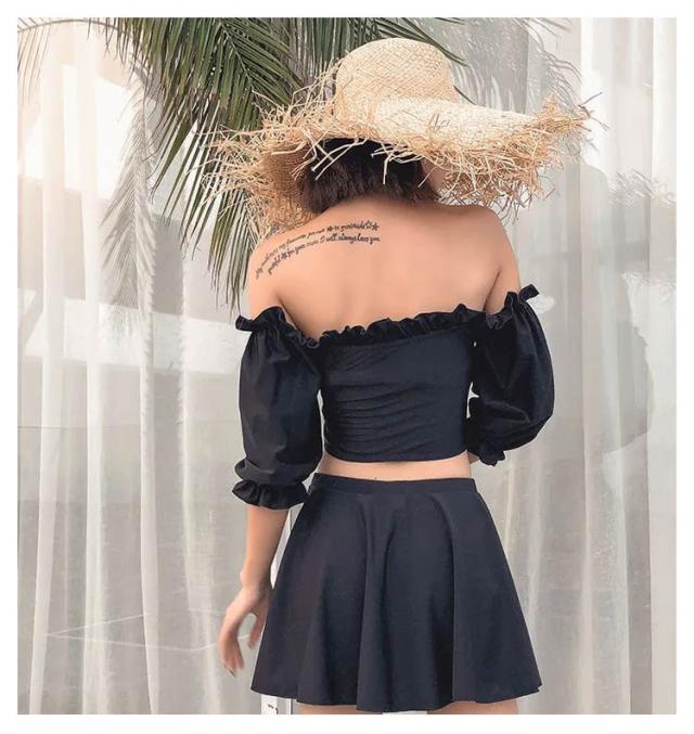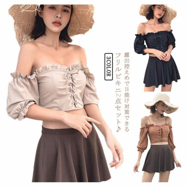 | 露出控えめで日焼け対策できるフリルビキニ3点セット♪ オフショルスタイルにもなるので2wayの着こなしを楽しんで♪ ノンワイヤーだからストレスフリーで快適☆ ひらっとフレアスカートでヒップ〜太もも周りをカバーできる◎ お洒落して思い出をSNSに残そう! | |