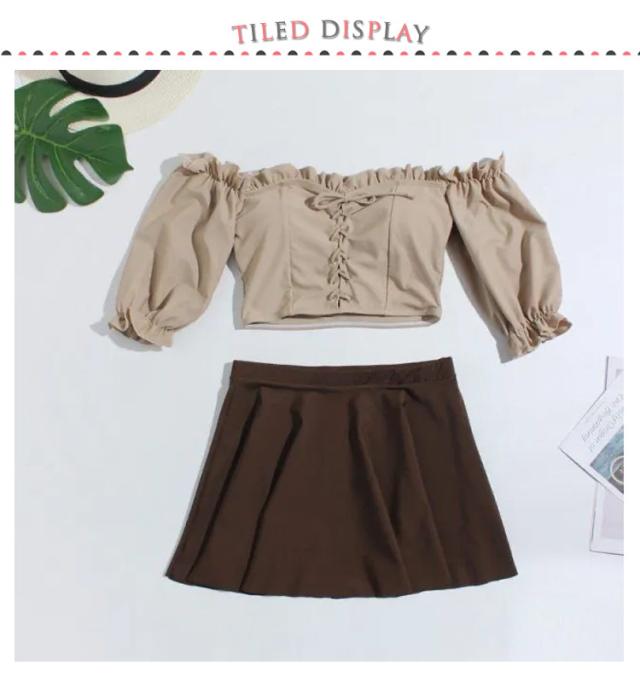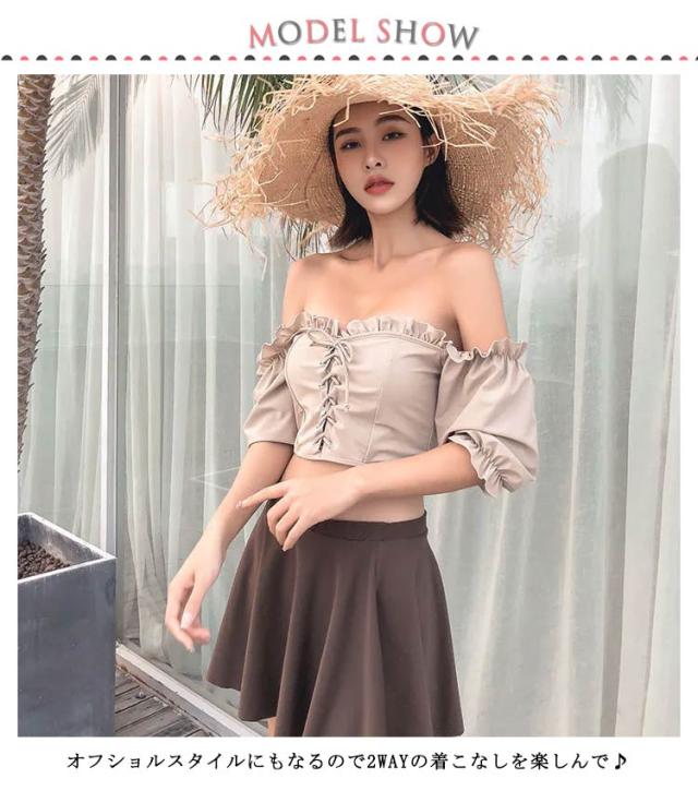 2点セット ビキニ 水着 レディース オフショルダー 送料無料 2way フリル スカート フレア 体型カバー 大きいサイズ ママ水着 チェック柄 上下セット セパレート オトナ女子水着 パッド付き バスト 盛れる