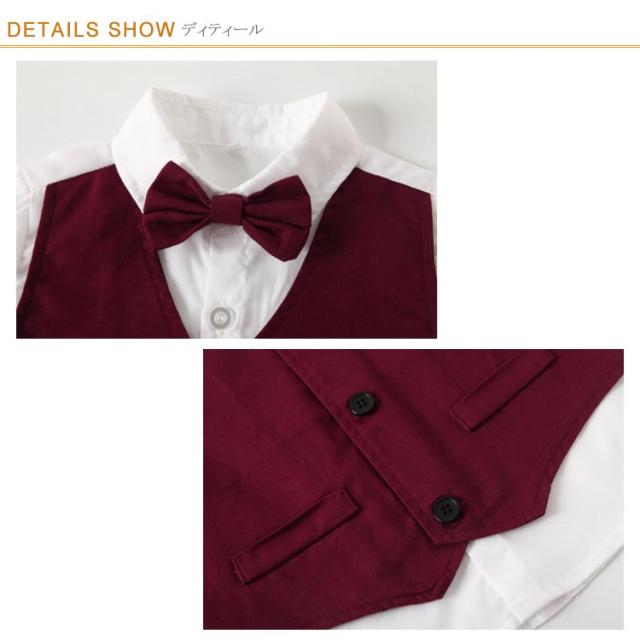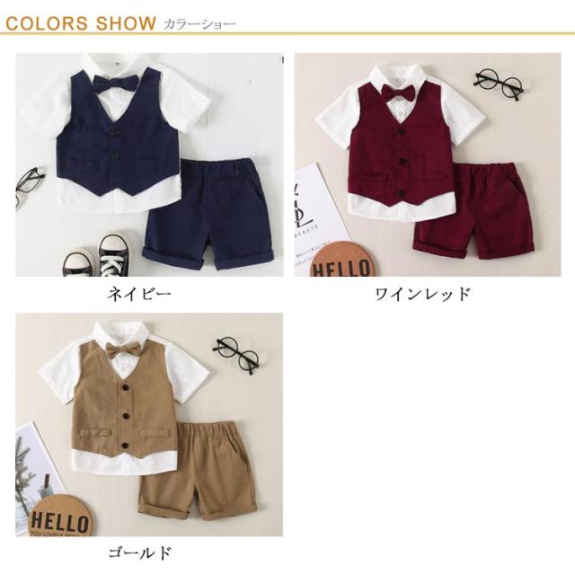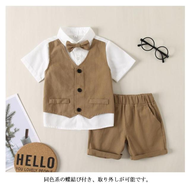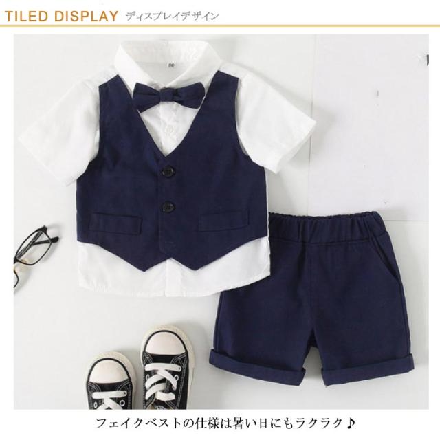 | デイリーからフォーマルシーンまで幅広く着用できる男の子上下セット フェイクベストの仕様は暑い日にもラクラク♪ 半袖、ハーフパンツのデザインなので、真夏でも快適、夏に最適の涼しげな生地を採用します。 パンツのウェストは総ゴムになっているので、小さなお子様も楽に穿いていただけます。 同色系の蝶結び付き、取り外しが可能です。 七五三や卒入学式、発表会、ちょっとしたお出かけや、冠婚葬祭まで幅広いシーンに使える上下セット♪ | |