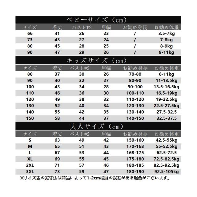 | サイズ | ベビー66 ベビー73 ベビー80 ベビー90 キッズ80 キッズ90 キッズ100 キッズ110 キッズ120 キッズ130 キッズ140 キッズ150 大人S 大人M 大人L 大人XL 大人2XL 大人3XL |