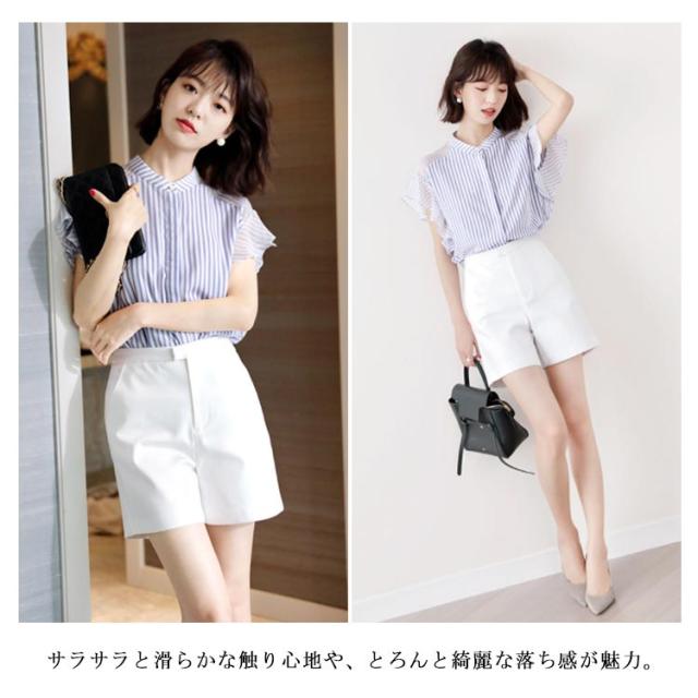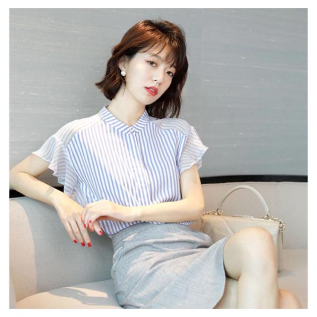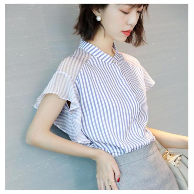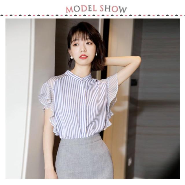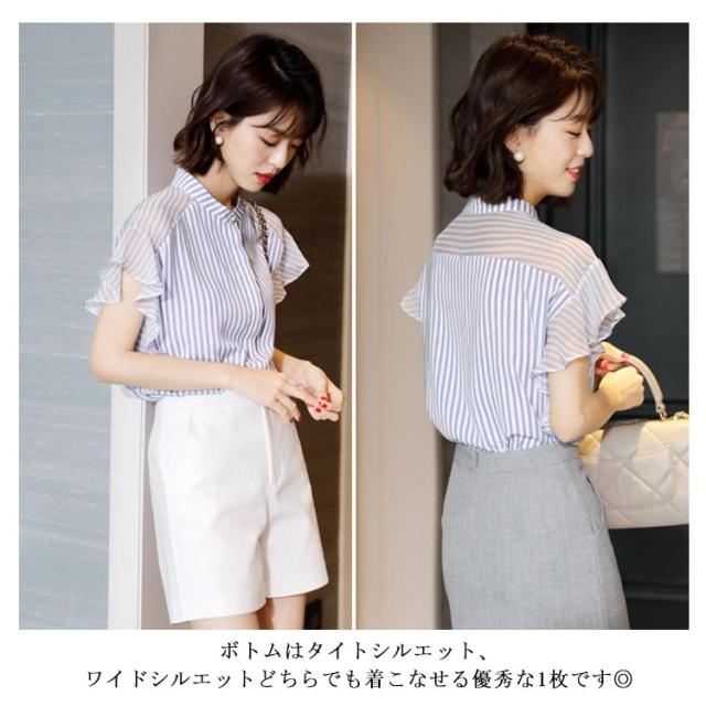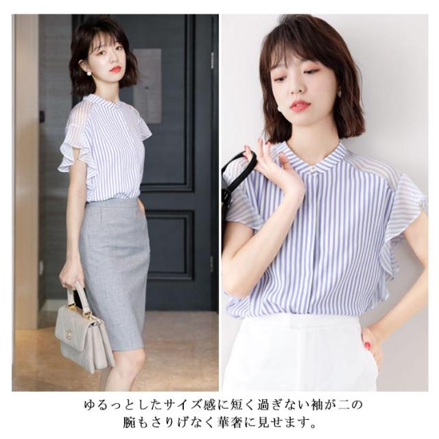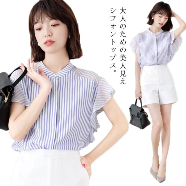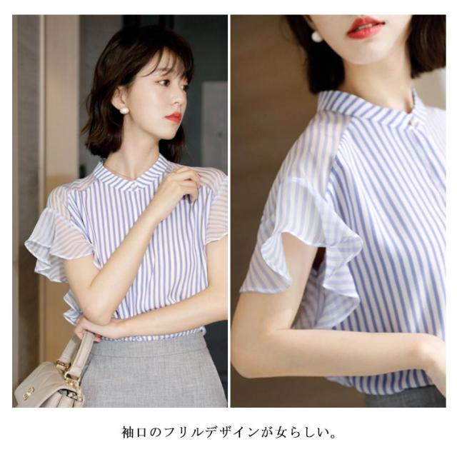 半袖 立ち襟 レディース 袖フリル オシャレ 大きいサイズ 20代 透け感 シフォン ボーダー シャツ トップス 体型カバー オフィス 大人可愛い 通勤 ブラウス OL カジュアル プレゼント 送料無料