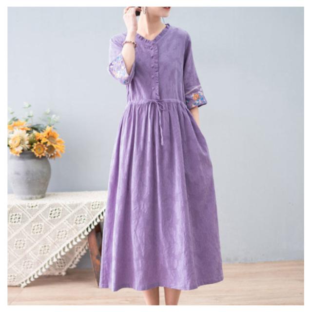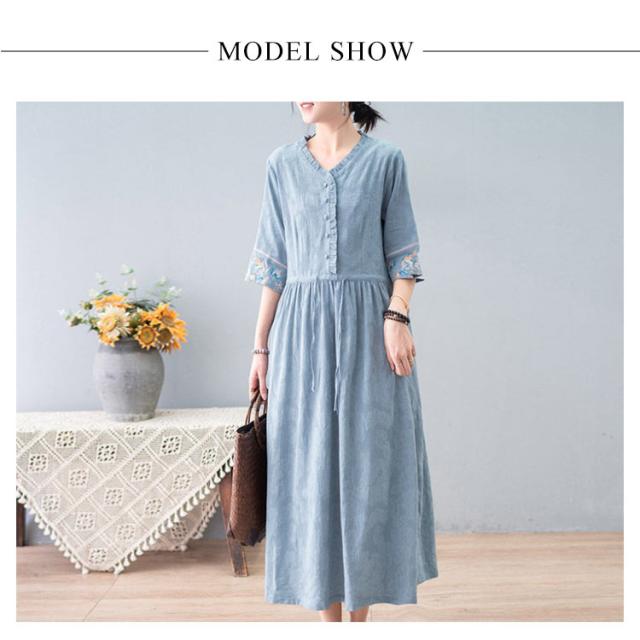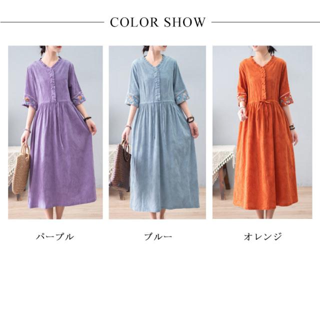 ロングワンピース Vネック ワンピース 綿麻ワンピース 春夏ワンピース M 涼しい フェミニン フリル 体型カバー ナチュラル 刺? かわいい ナチュラル L XL リネン風