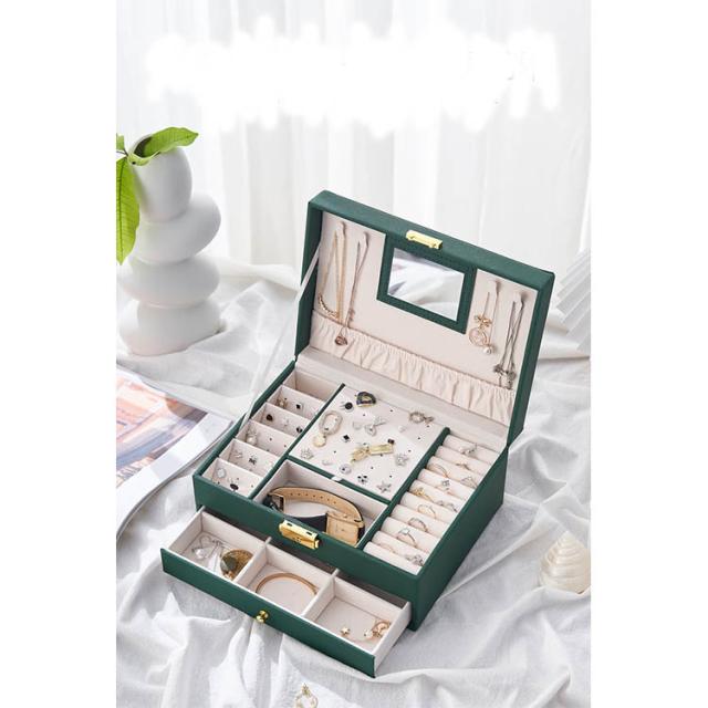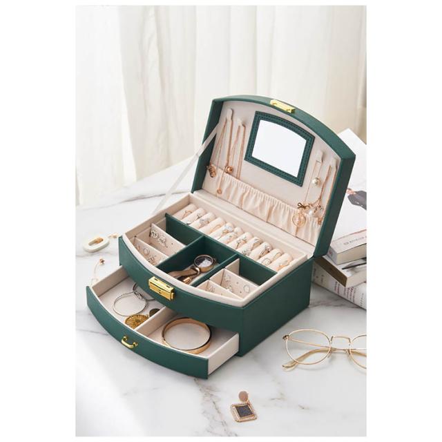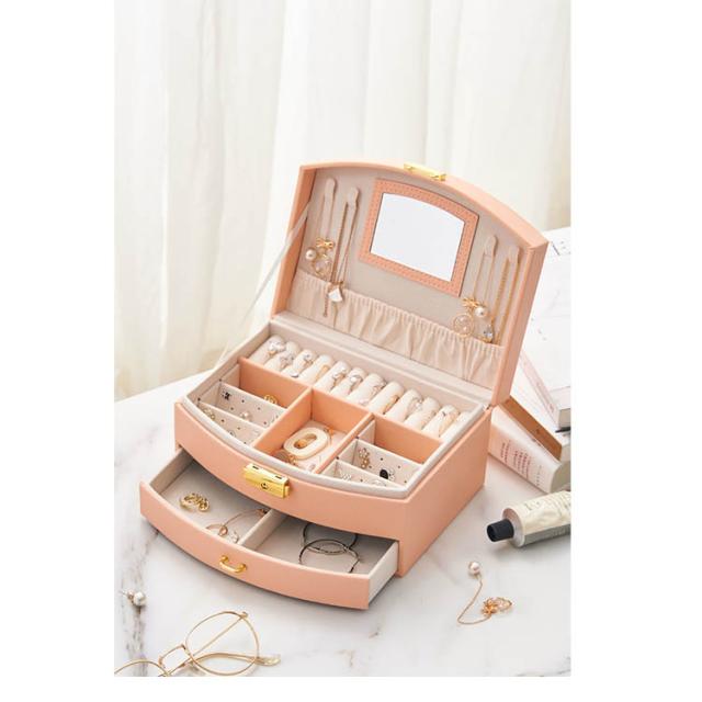 | 高級感のある大人かわいいアクセサリーケースです。 1段目は頻繁に着けるものやお気に入りの1軍を収納。 フタを開けてすぐに取り出せるため、時間がない人や着けるアクセサリーが決まっている人に便利です。 インテリアに合わせやすくシックなカラーリングは、コレクションケースとしてあなたにふさわしいデザインです。 イヤリングやピアス、リングなど、年々増えていくアクセサリー。ベルベット素材の内装でアクセサリーを傷めず、たくさんのコレクションを収納できます。 | |