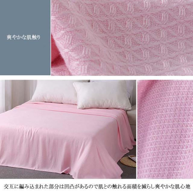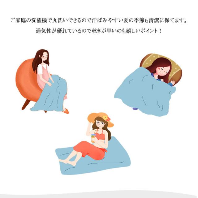 | 寝苦しい夏にぴったりの涼感タオルケット ひんやり涼感素材を採用するので蒸し暑い日本の夏にぴったり! 交互に編み込まれた部分は凹凸があるので肌との触れる面積を減らし爽やかな肌心地です♪ 吸湿速乾で汗をかいてもべたつきにくいから暑い季節も快適にお使いいただけます。 ご家庭の洗濯機で丸洗いできるので汗ばみやすい夏の季節も清潔に保てます。通気性が優れているので乾きが早いのも嬉しいポイント! | |