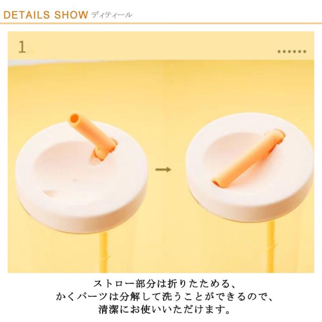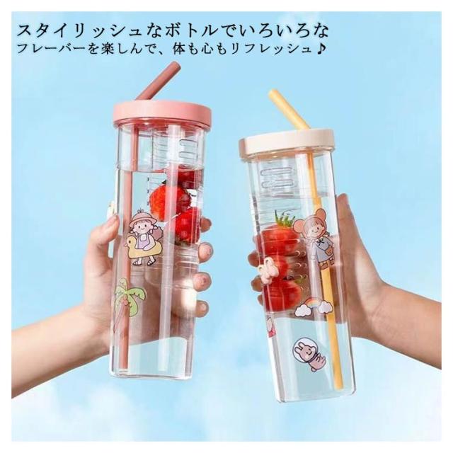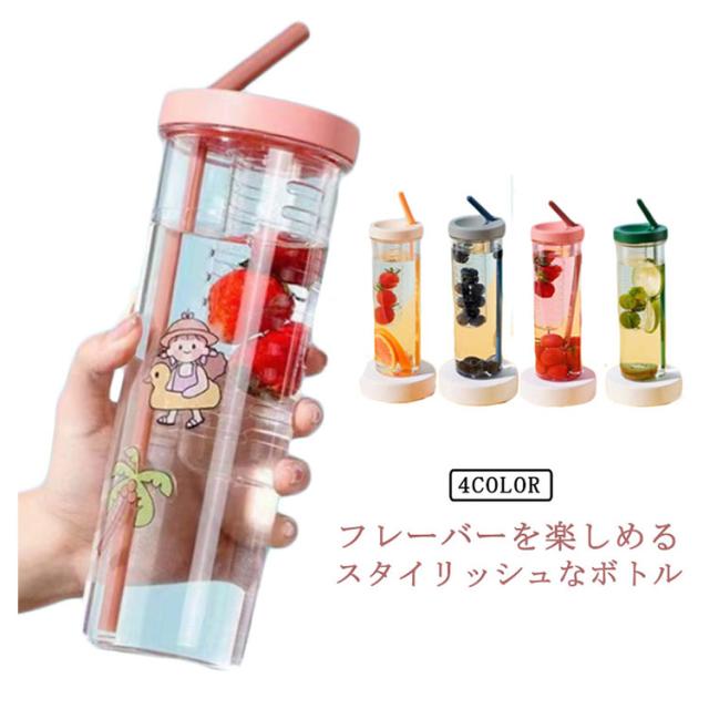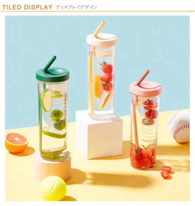 | フレーバーを楽しめるスタイリッシュなボトル 水を入れたボトルに好みのフルーツやハーブを入れたインフューザーをセットするだけで、フレーバーウォーターを作れます。 透明のボトルからフルーツが写り、見た目も鮮やかでカラフルなフルーツウォーターボトルになります。 ストロー部分は折りたためる、かくパーツは分解して洗うことができるので、清潔にお使いいただけます。 スタイリッシュなボトルでいろいろなフレーバーを楽しんで、体も心もリフレッシュ♪ | |