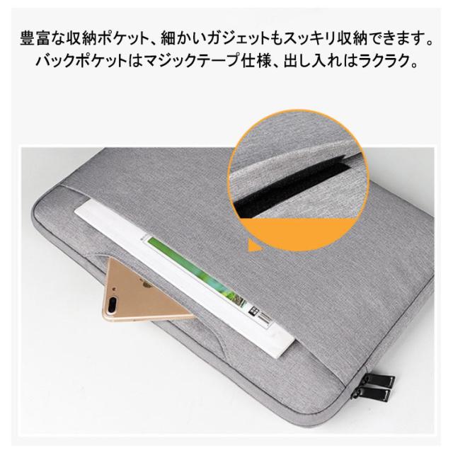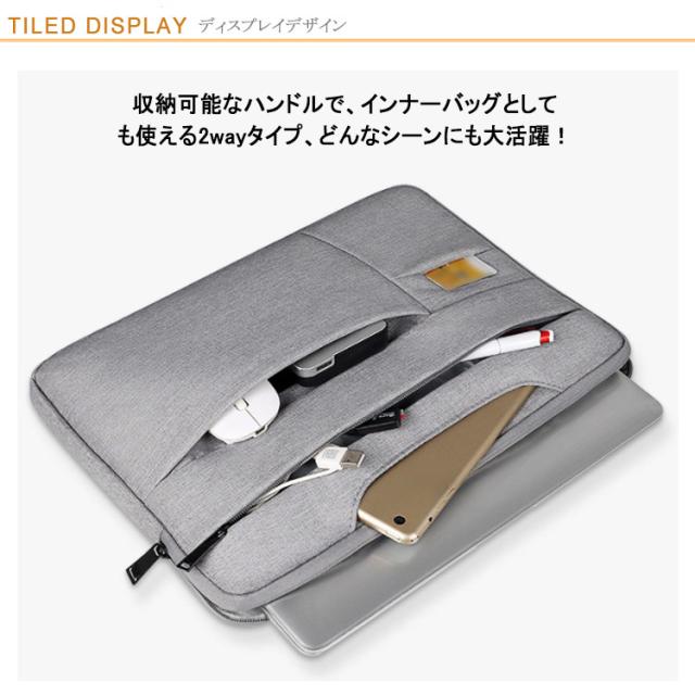 | どんなシーンにも持ち歩く便利なノートパソコンケース 収納可能なハンドルで、インナーバッグとしても使える2wayタイプ、どんなシーンにも大活躍! 表面は撥水素材を採用するので大切なPCを守ります。 豊富な収納ポケット、細かいガジェットもスッキリ収納できます。バックポケットはマジックテープ仕様、出し入れはラクラク。 内側全面にフワフワの起毛素材を採用、クッションの役割でノートパソコンを衝撃から守ります。 広い開け口とダブルファスナーで中身の取り出し簡単。 ビジネスでもカジュアルでも、どんな場所でも使えるシンプルなスタイリッシュデザイン。 | |