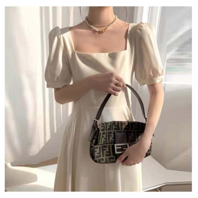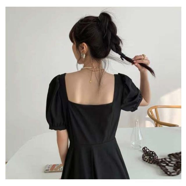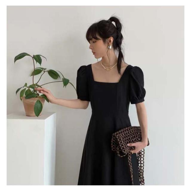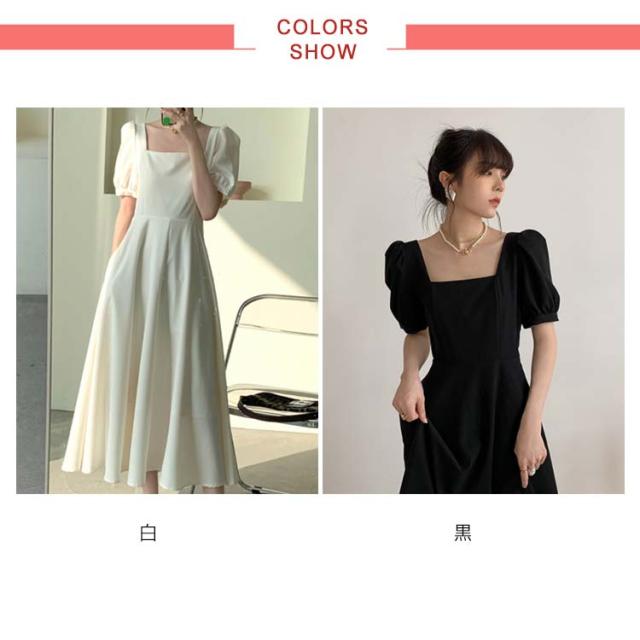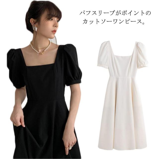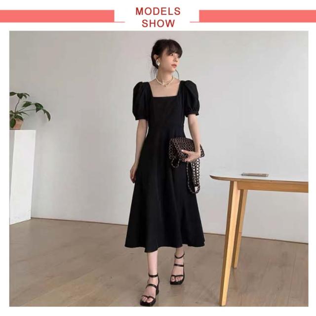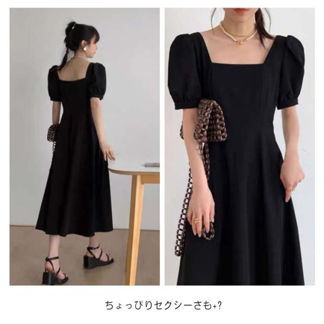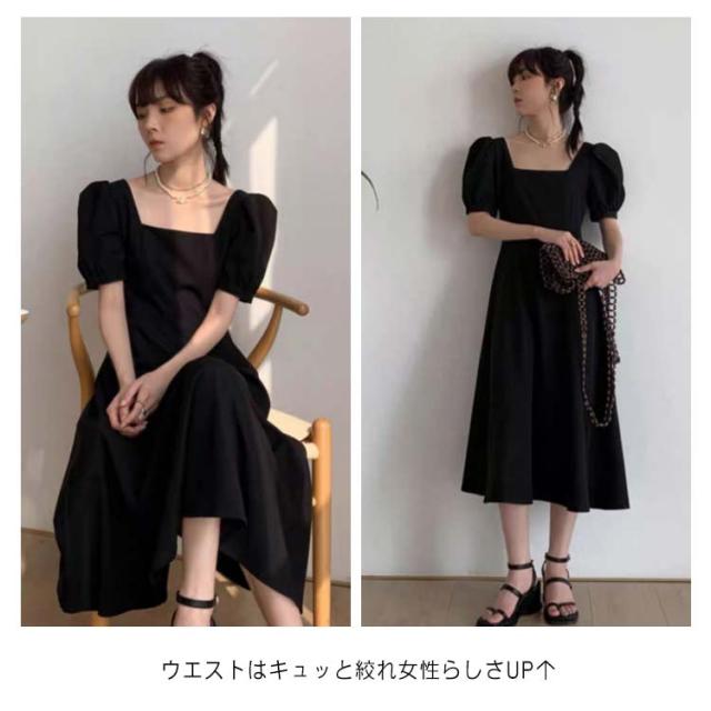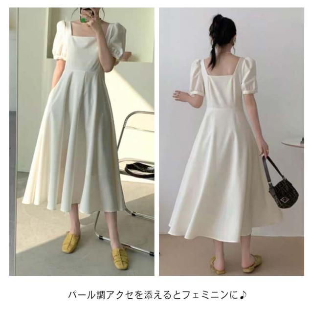 韓国ファッション スクエアネック ワンピース 半袖 ボリューム袖 春 大人 ロング丈 パフスリーブ カジュアル ロングワンピース 夏 同窓会 無地 Aライン ボリュームスリーブ パーティー エレガント お洒落着 上品 レディース