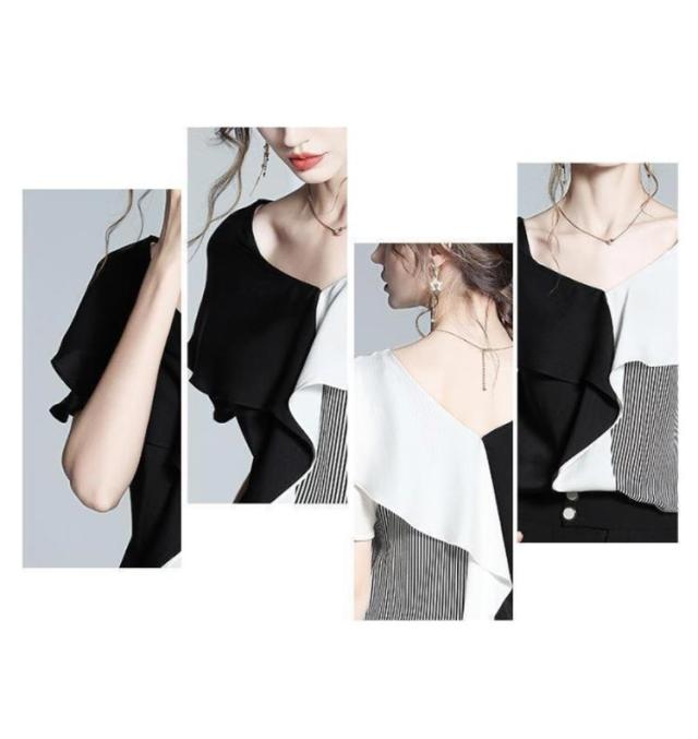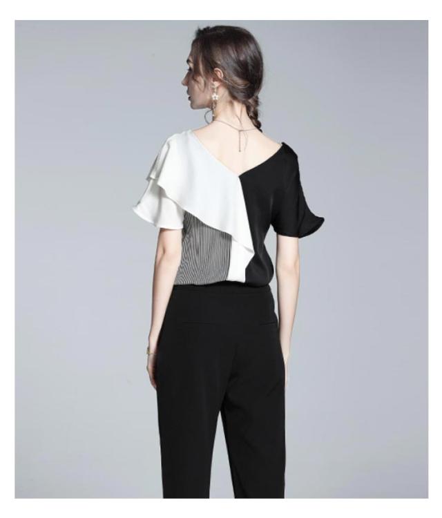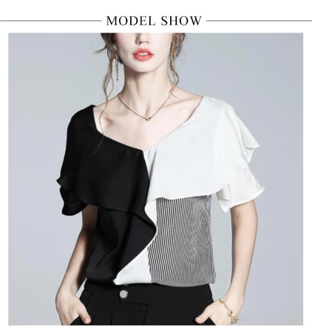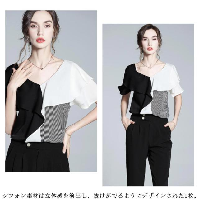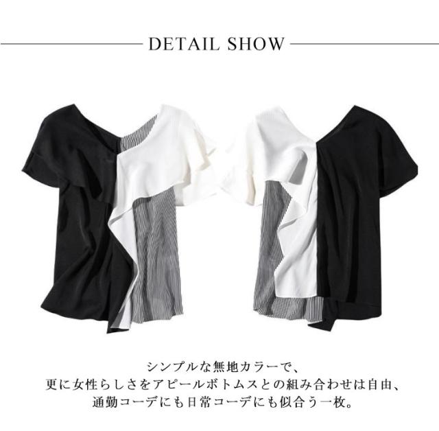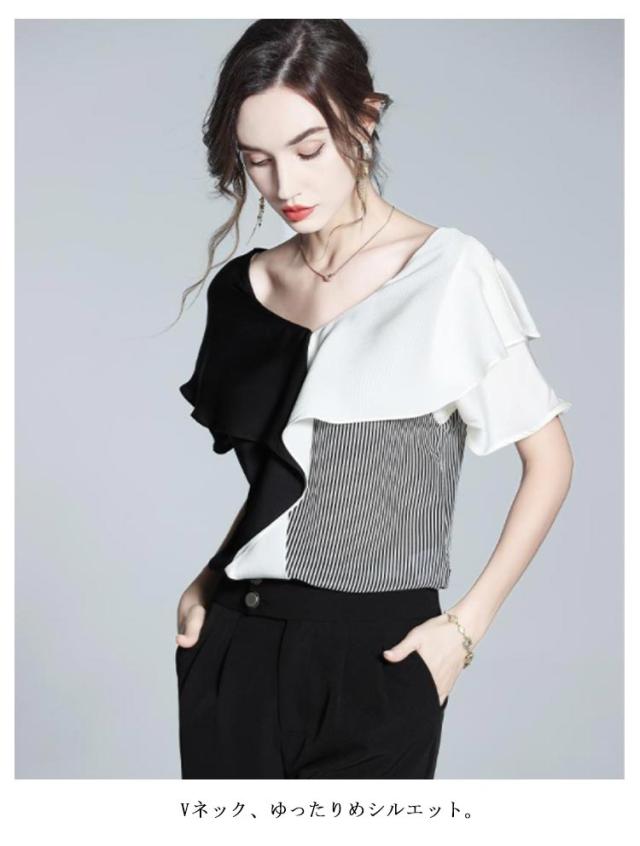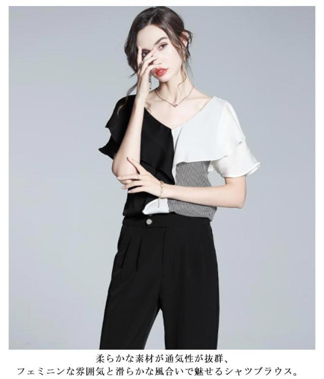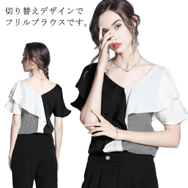 切り替え 半袖 ブラウス Vネック フリルシャツ シャツ シフォンブラウス お呼ばれ 大人 フリル プルオーバー 大人 ビジネス 通勤 OL レディース