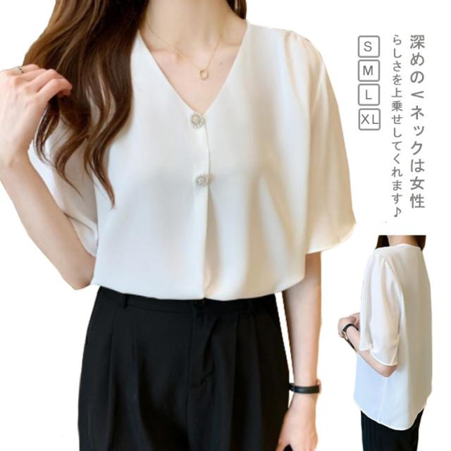 フリル ブラウス 入学式 トップス フォーマル 上品 シャツ オケージョン フリル袖 フリルネック きれいめ Vネック シフォン 半袖 パールボタン 春 夏 春夏 通勤 カジュアル オフィス OL 母 ママ 大人可愛い レディース