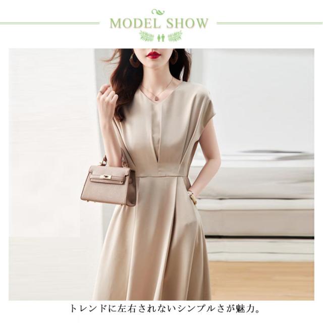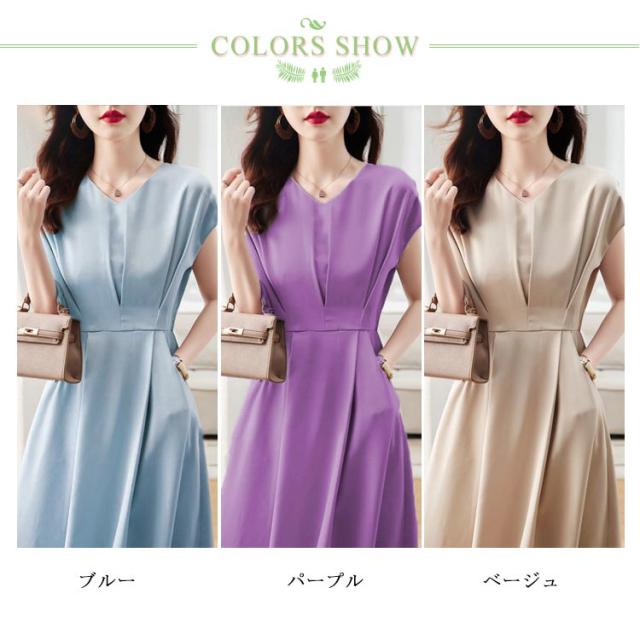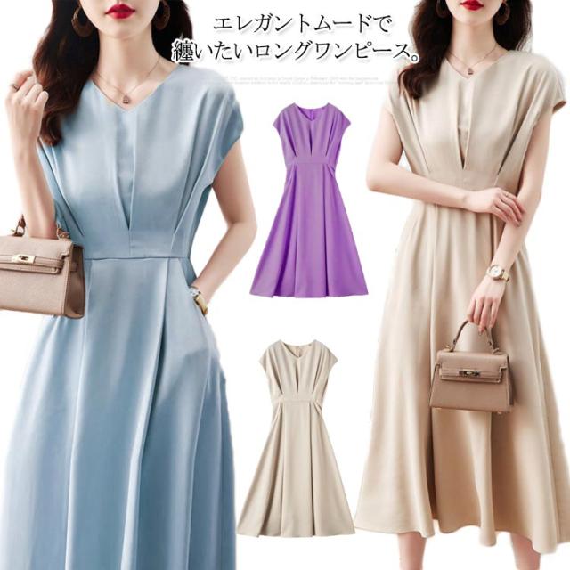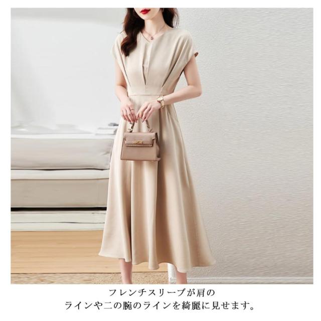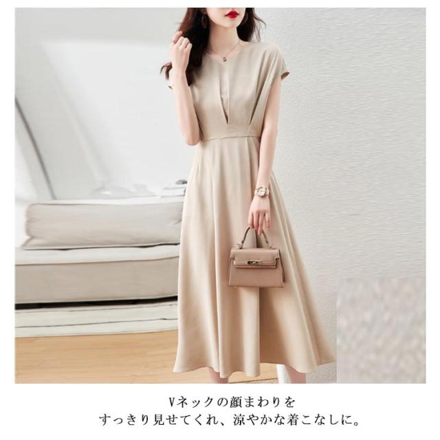 フレンチスリーブ お仕事 ロングワンピース ワンピース フレンチスリーブ Vネック ドレス フレアワンピース 体型カバー ワンピ 通勤 オフィス 発表会 【送料無料】セレモニー 大きいサイズ ベージュ ブルー 20代 30代 結婚式